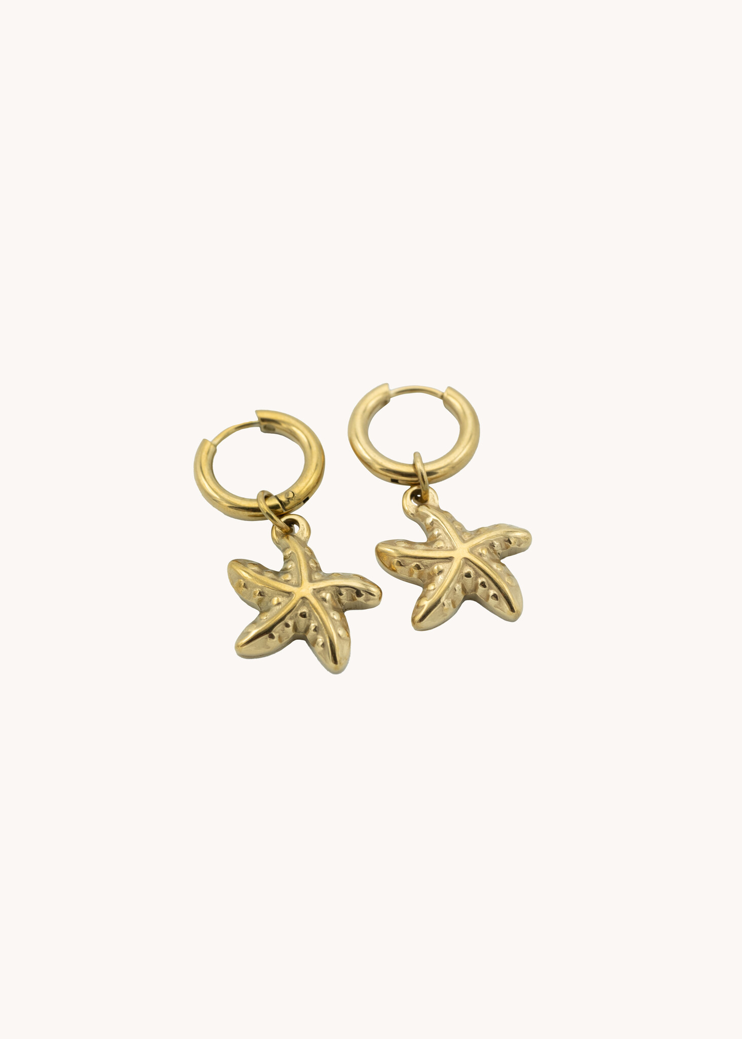 Deze gouden oorbellen zijn een echte eyecatcher! Met hun subtiele bedeltje in de vorm van een zeester geven ze je look direct een zomerse touch.