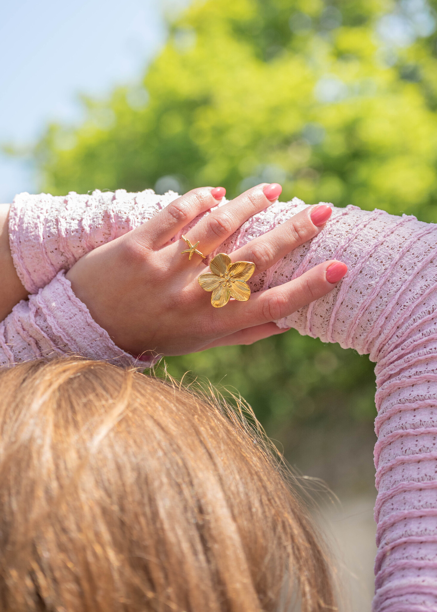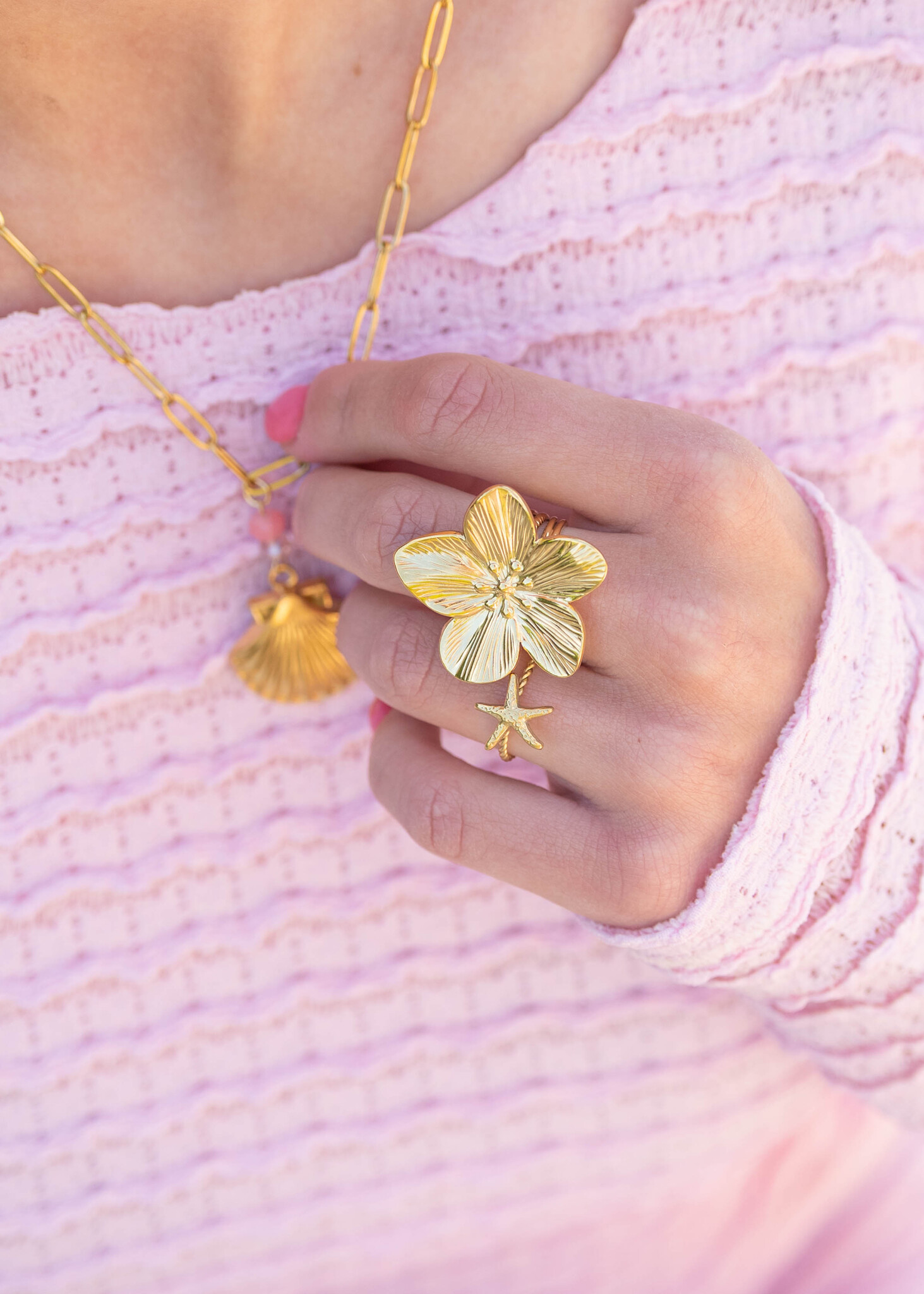 Deze prachtige gouden ring is een echte eyecatcher! De gedraaide band geeft de ring een speelse touch, terwijl de subtiele zeester voor een vleugje zomerse vibes zorgt.