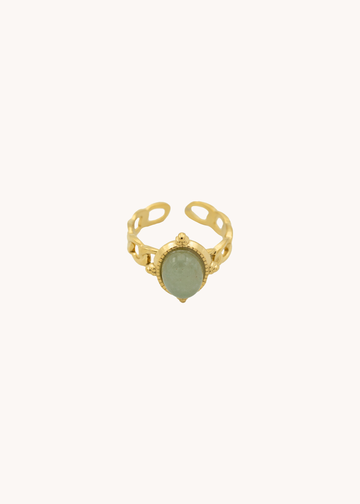 Deze prachtige ring is een echte eyecatcher! De glinsterende gouden afwerking geeft 'm een luxe uitstraling, terwijl de betoverende groene steen zorgt voor een vleugje mysterie.