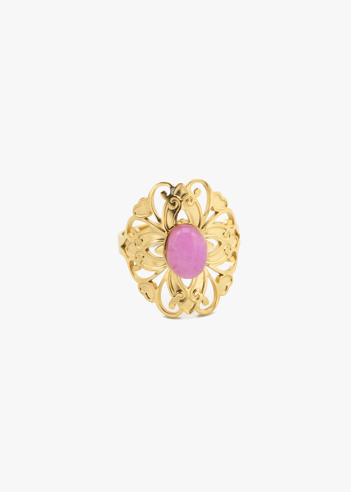 Op zoek naar een eyecatcher voor je outfit? Deze gouden ring met roze steen is een echte statement piece!