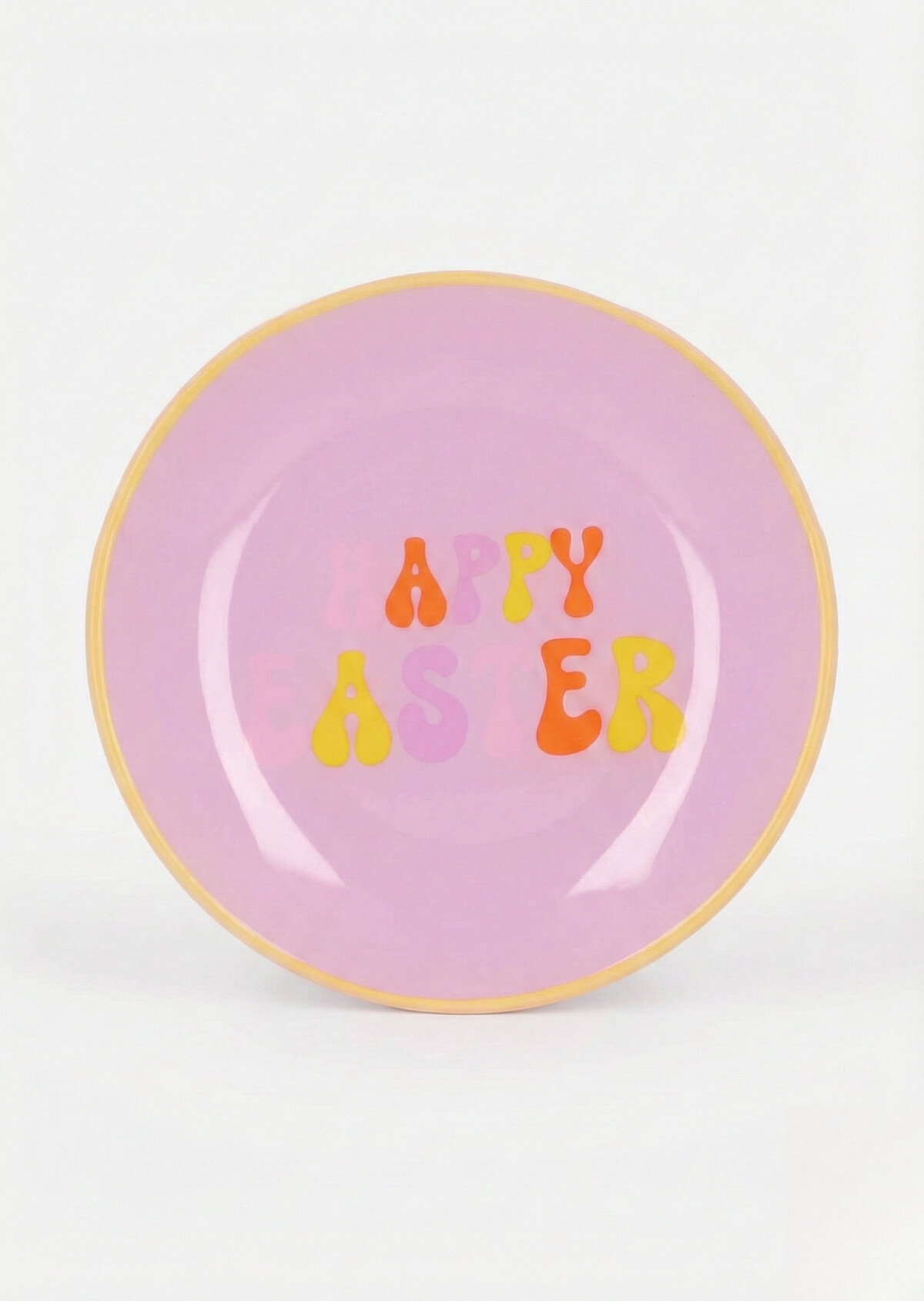 Maak je paastafel dit jaar extra feestelijk met dit vrolijke roze bordje. Met de tekst "Happy Easter" in kleurrijke, groovy letters brengt dit item direct de lente in huis. De zachte roze basis en het zonnige gele randje zorgen voor een frisse, retro look die perfect past bij een gezellig paasontbijt of een uitgebreide brunch.