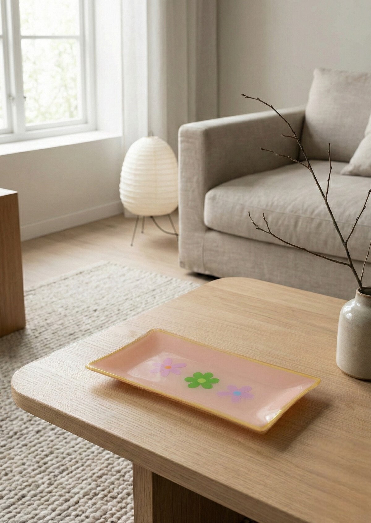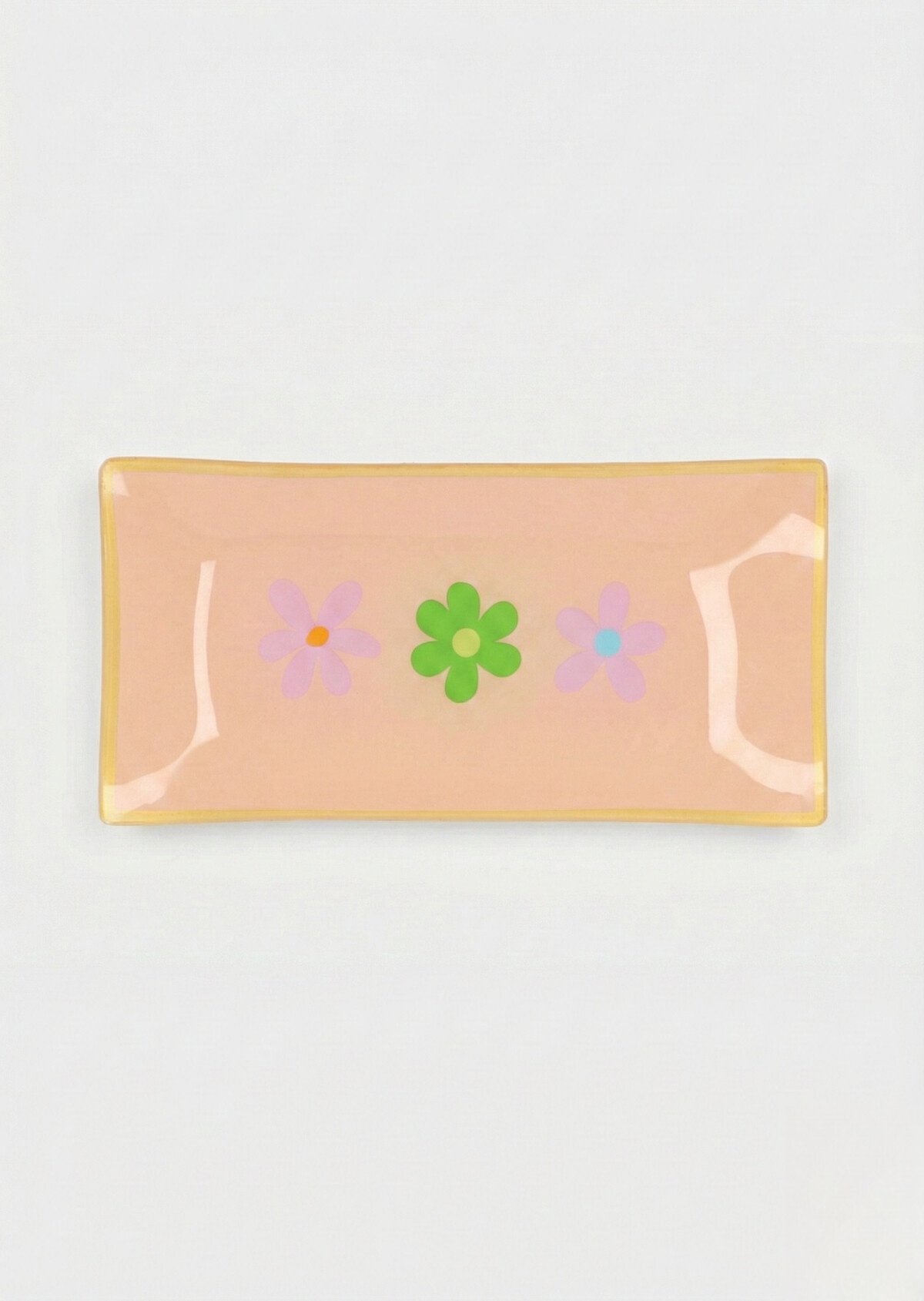 Ben je op zoek naar een manier om je interieur net dat beetje extra kleur en gezelligheid te geven? Dit charmante rechthoekige schaaltje is precies wat je zoekt. Met een zachtroze/perzik kleurige basis en een speelse print van drie bloemen in lila en fris