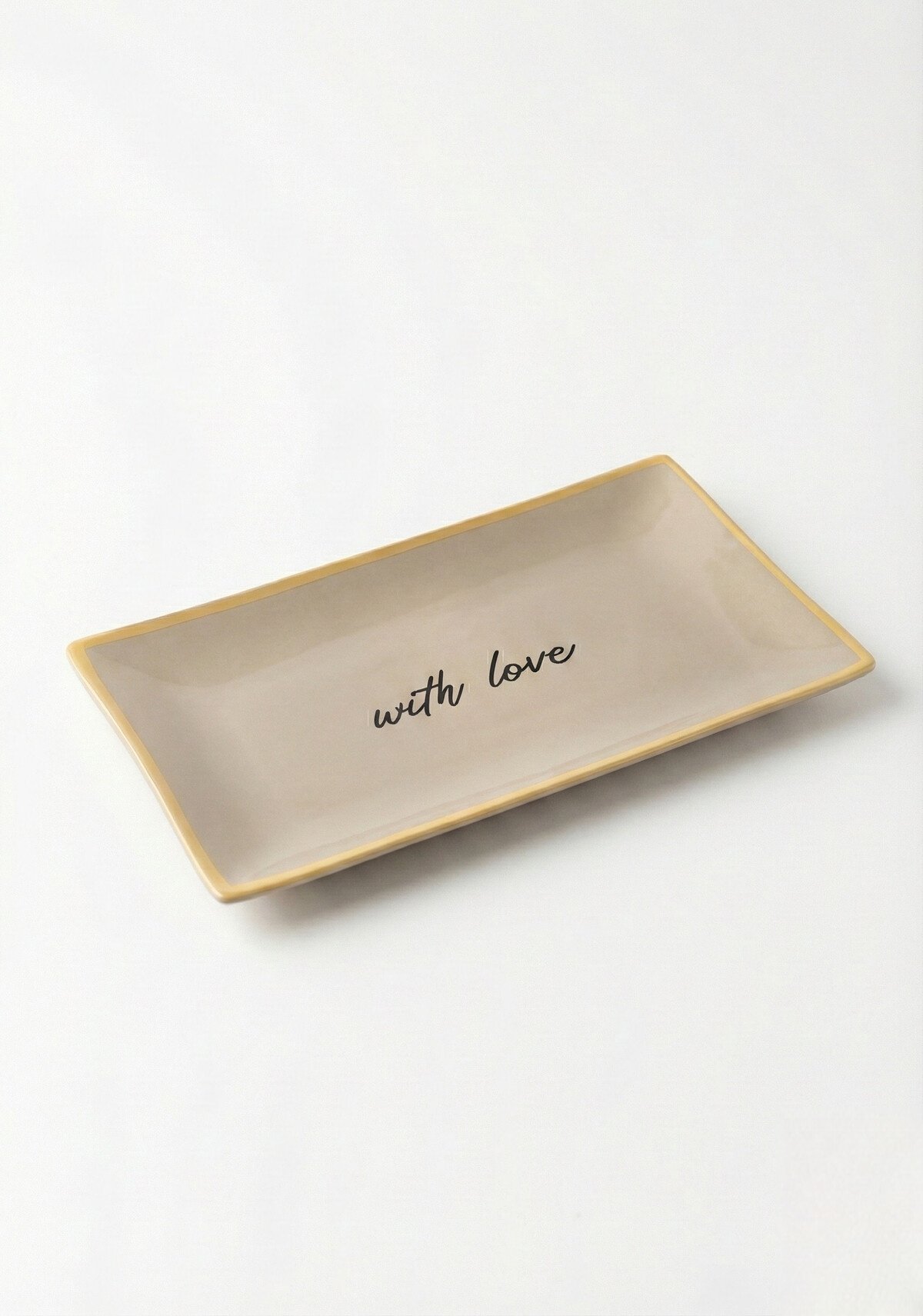 Zoek je een stijlvol en liefdevol cadeau? Dit prachtige glazen schaaltje in een warme beige/taupe tint past door zijn neutrale kleur in vrijwel elk interieur. De sierlijke, handgeschreven tekst "with love" en het chique gouden randje maken het plaatje compleet.