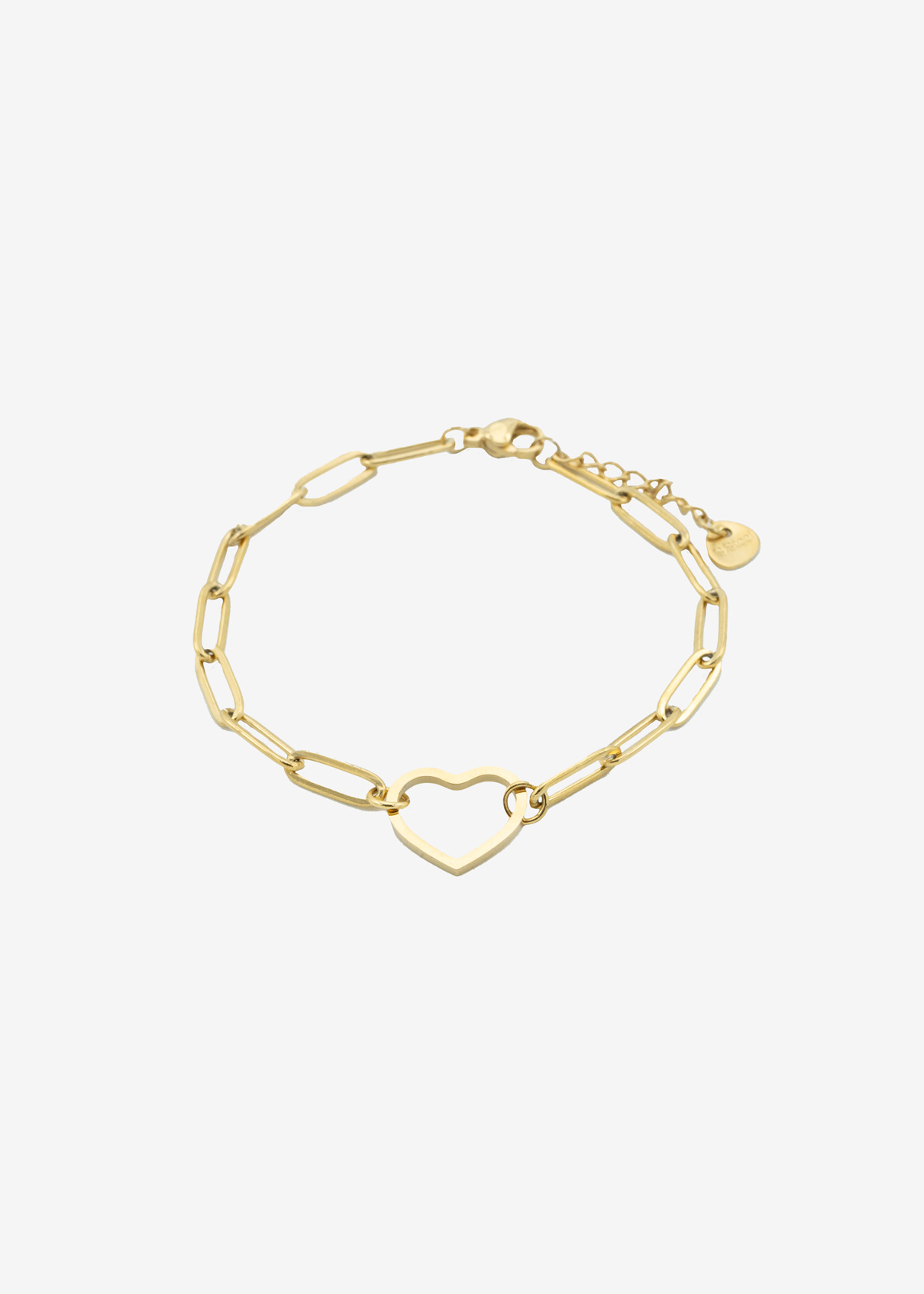 Deze gouden armband is een echte eyecatcher! Met zijn trendy schakeldesign en schattige hartje is dit sieraad perfect voor elke fashionista die van een vleugje romantiek houdt.