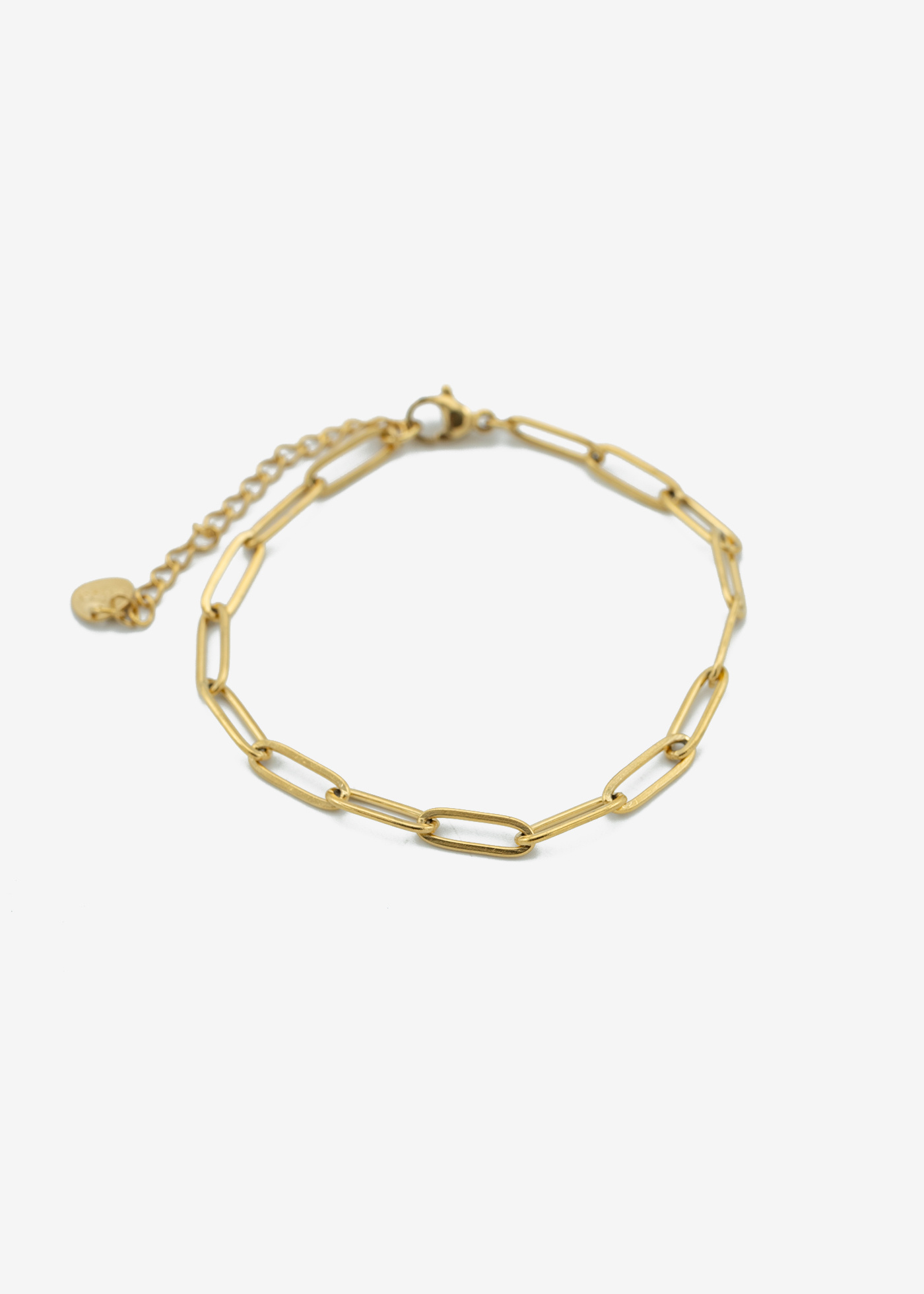 Deze schakelarmband is helemaal on-trend met zijn minimalistische design. De dunne schakels geven de armband een elegante uitstraling, terwijl de gouden kleur zorgt voor een vleugje glamour.