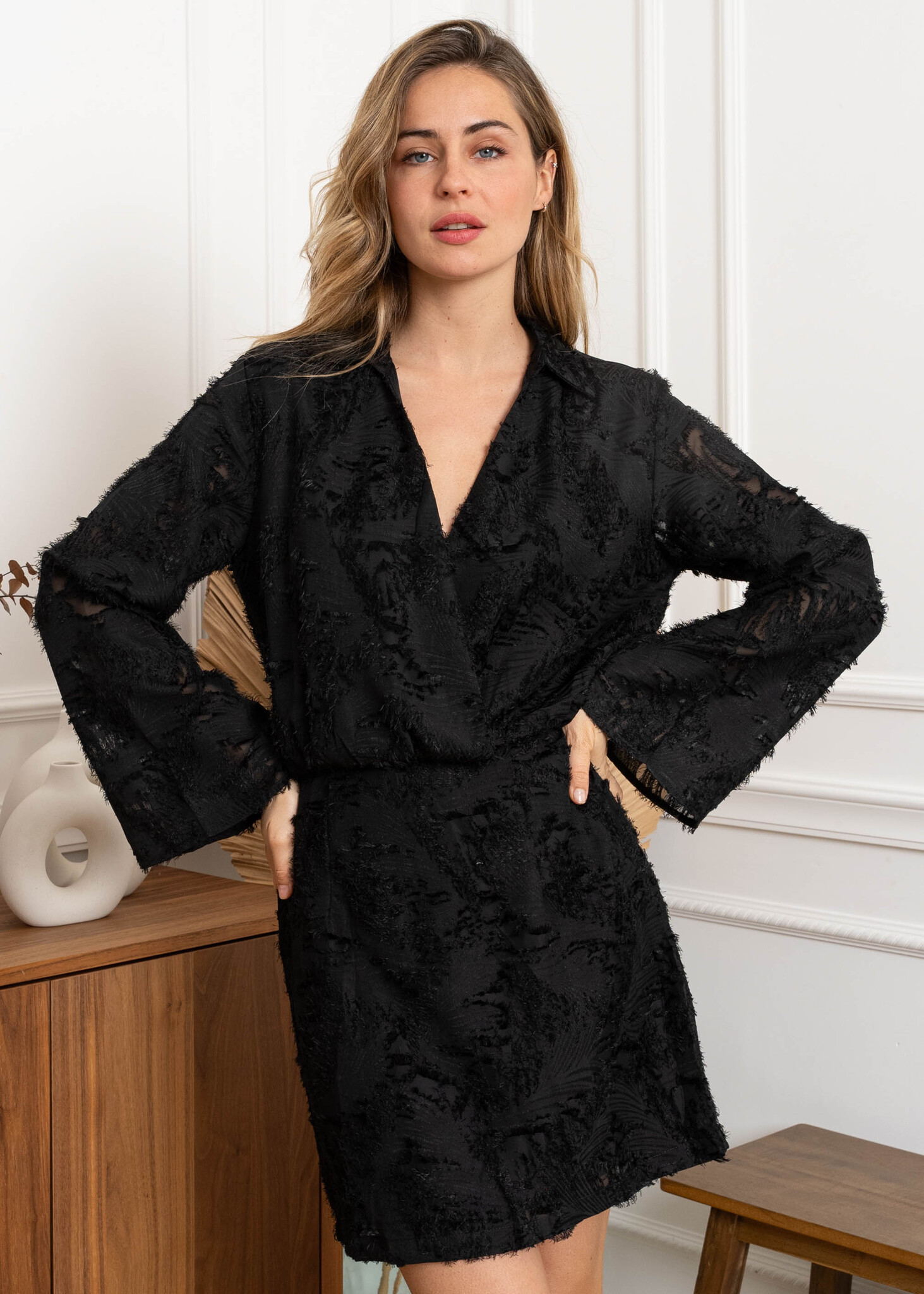 Klaar om te stralen? Deze little black dress met een twist is perfect voor een avondje uit of een speciale gelegenheid. De elegante, lange mouwen en het flatterende wikkelontwerp creëren een look die zowel stijlvol als sexy is.