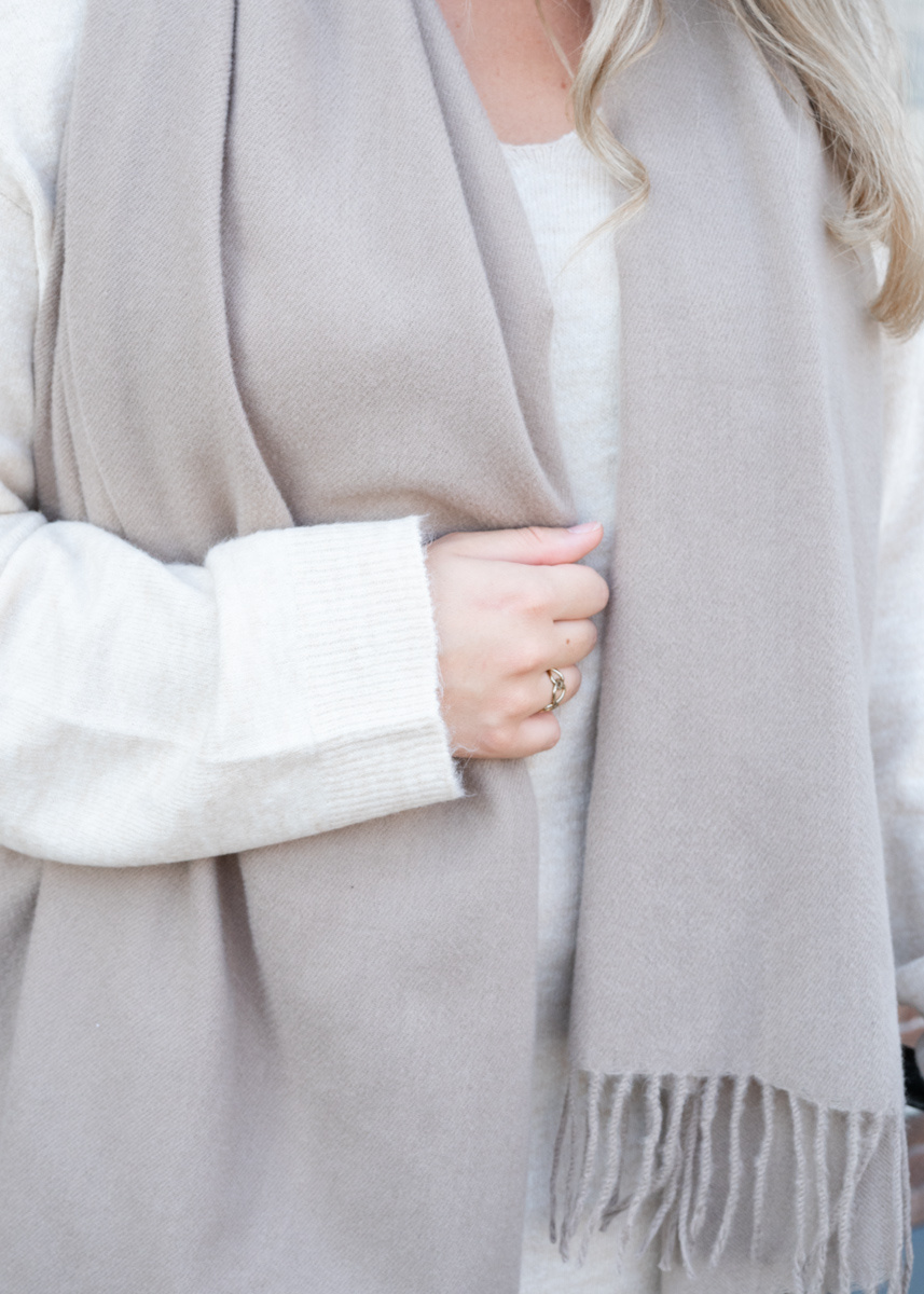 Combineer deze beige sjaal met een oversized trui en je favoriete jeans voor een casual look, of draag hem op een elegante jas voor een chique touch. De neutrale kleur maakt hem makkelijk te combineren met al je outfits.