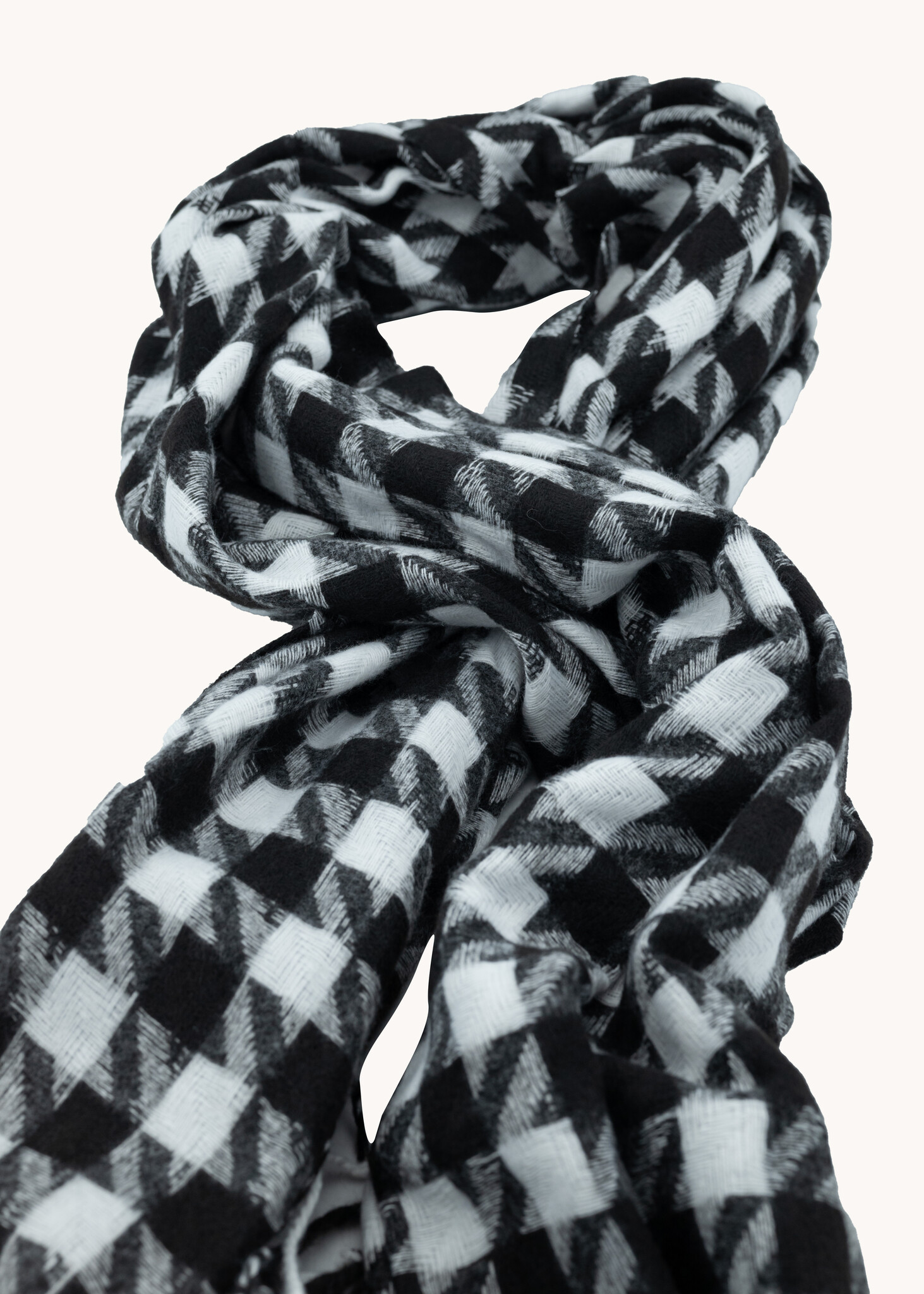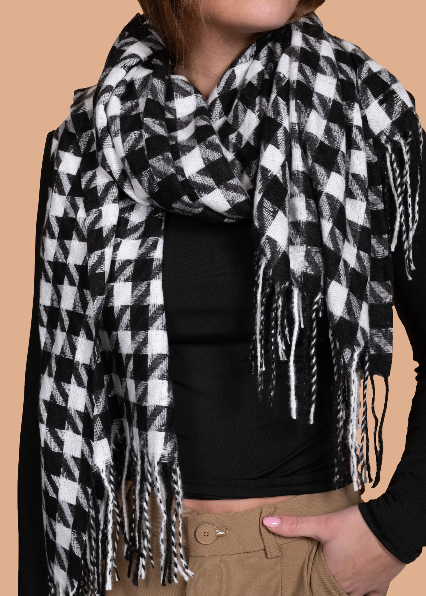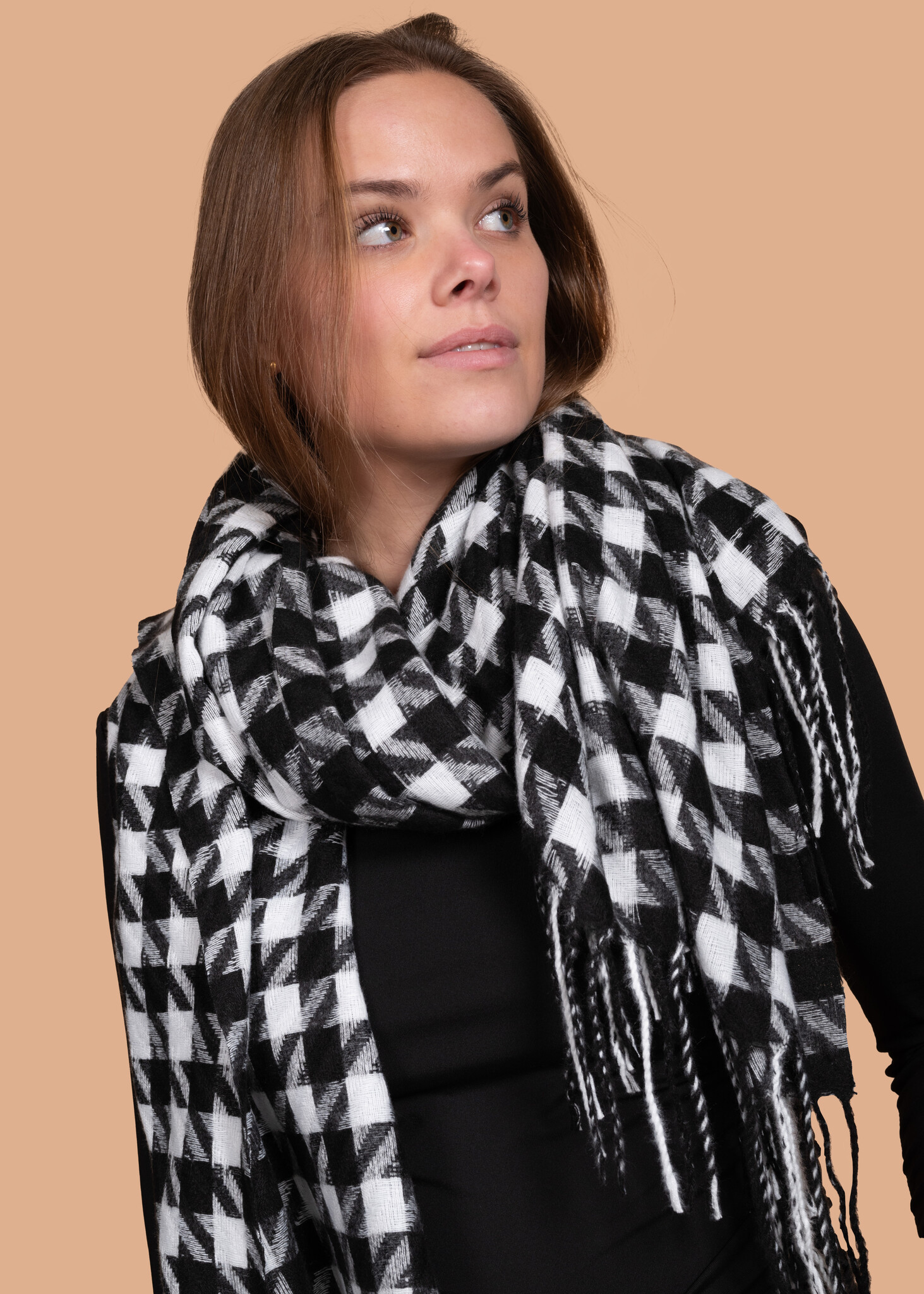 Deze warme sjaal met ruiten is perfect voor de koudere dagen. Het klassieke zwart-witte patroon geeft je outfit een instant stijlvolle touch, terwijl de zachte stof je heerlijk warm houdt.