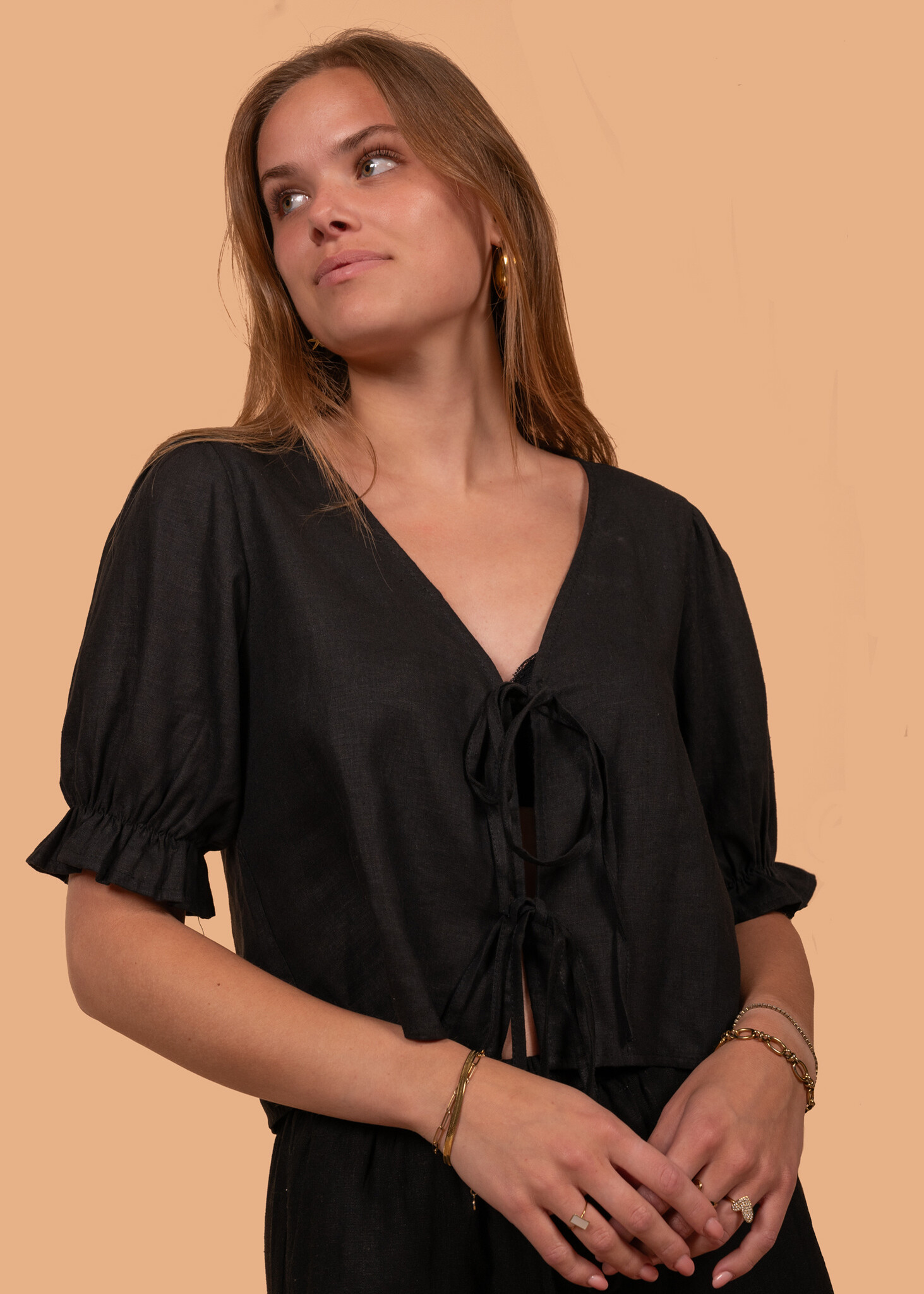 Wat deze zwarte top zo speciaal maakt? De speelse strikjes aan de voorkant! Je kunt de top op verschillende manieren strikken voor een look die bij jou past.