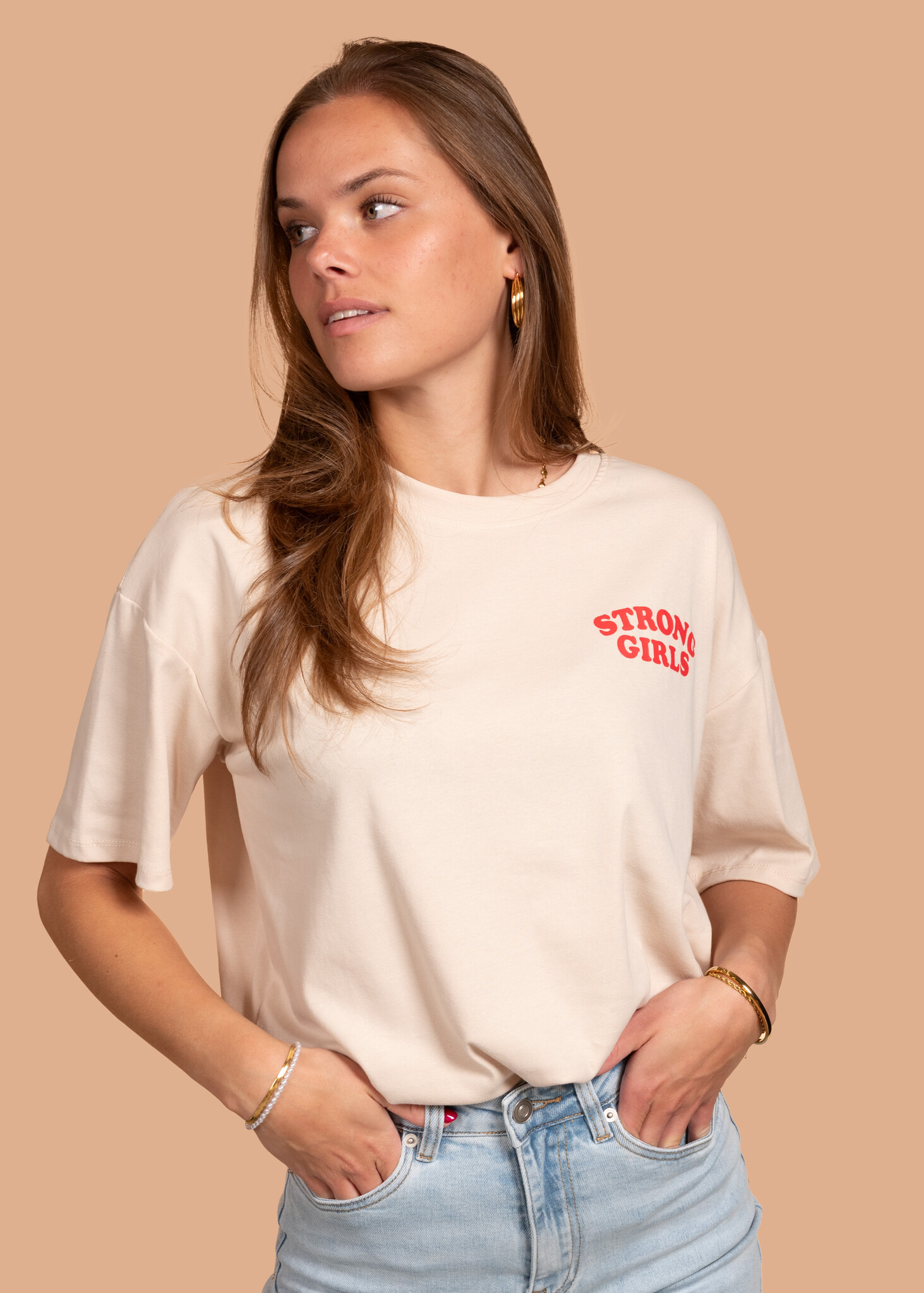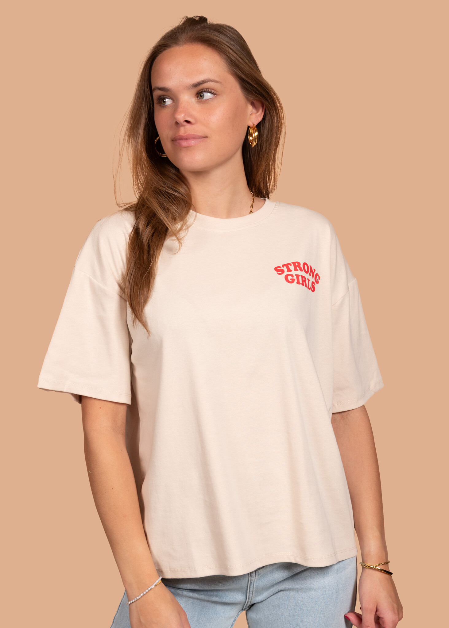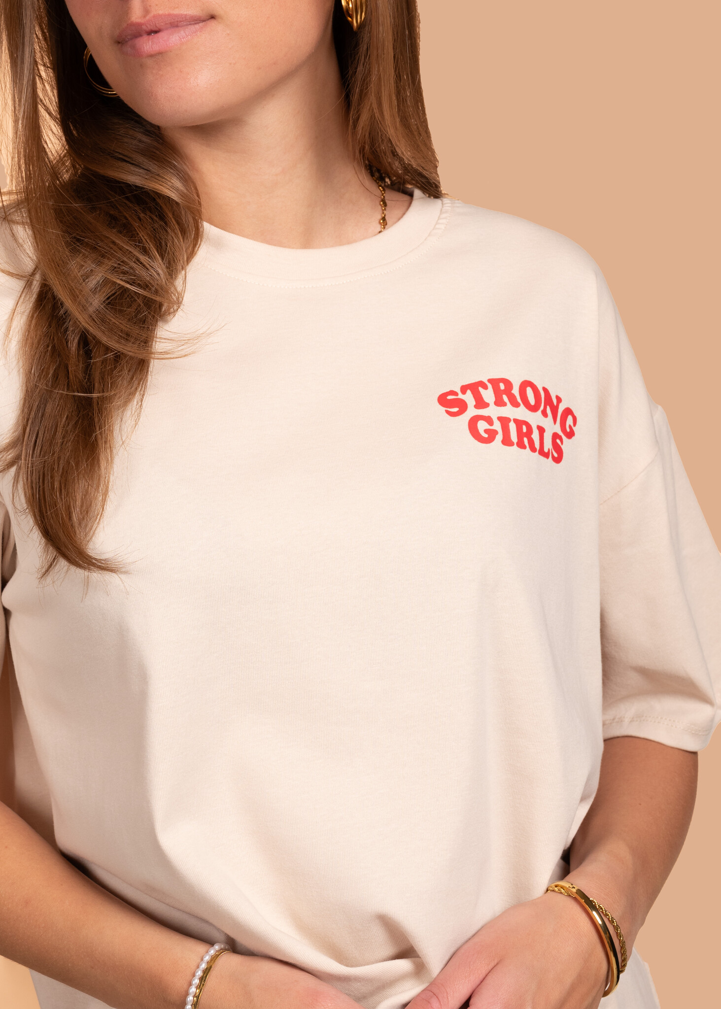 Hello girlboss! Ben jij klaar om de wereld te laten zien wat je in huis hebt? Met dit strong girls shirt maak je een statement, zonder een woord te zeggen. Dit beige t-shirt is super comfy en perfect om je innerlijke kracht te uiten. De rode tekst springt er lekker uit en geeft je outfit net dat beetje extra pit. Een echte must-have voor jouw kledingkast!