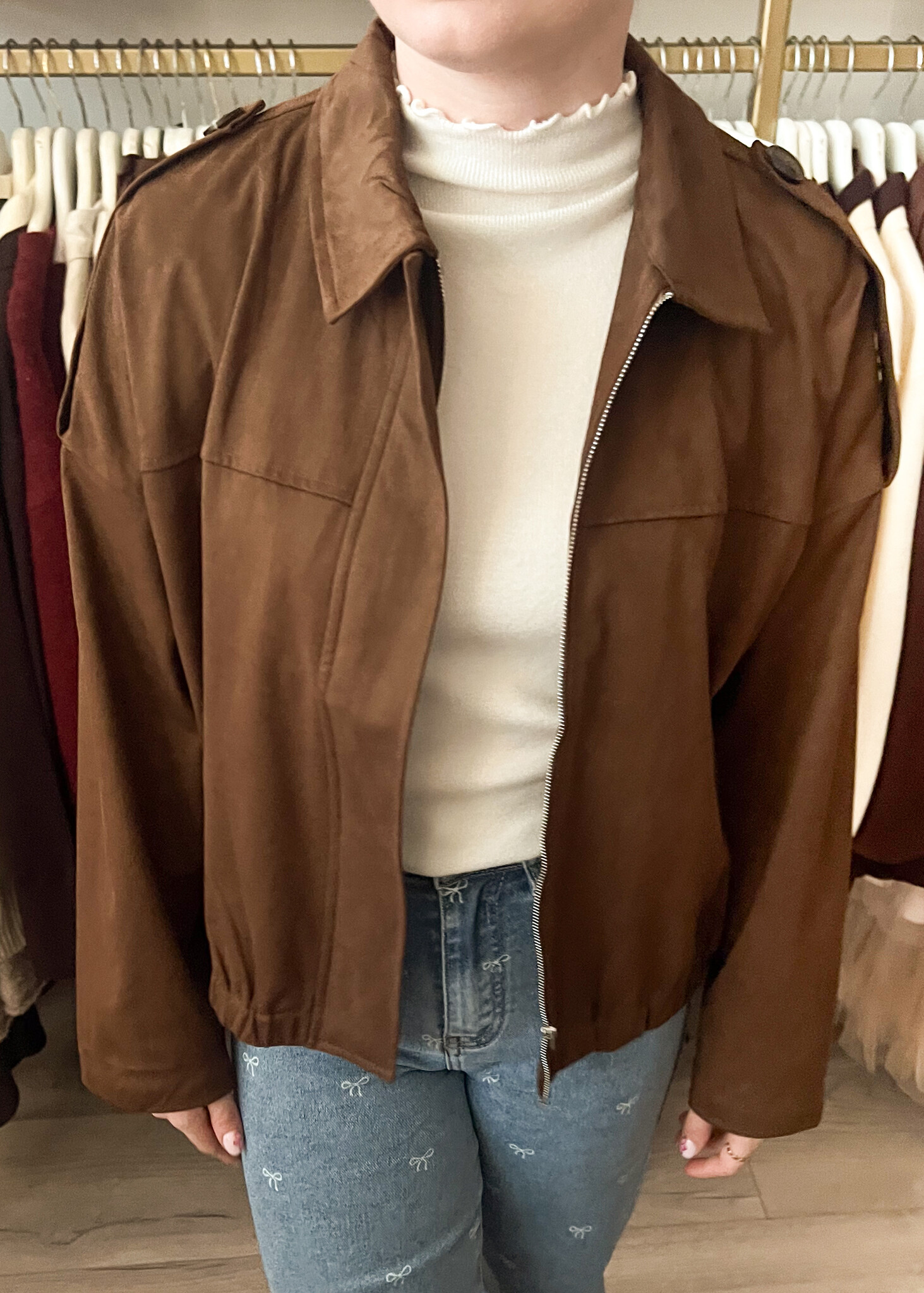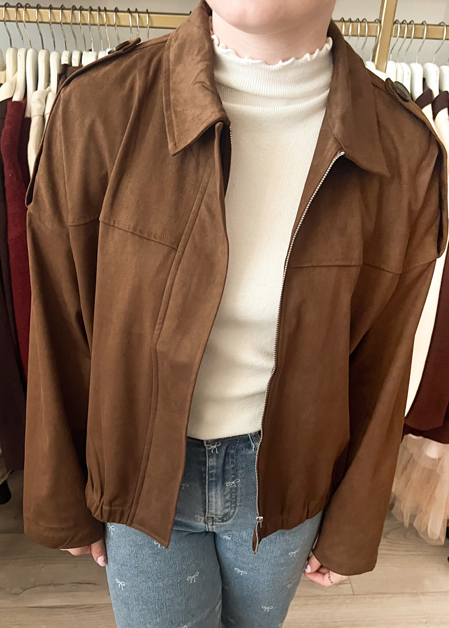 Aan verlanglijst toevoegenSuède bomber jacket✨ 4.8 / 5 score via Google Reviews 69,99 Incl. btw Op voorraad Maat S/M M/LSize: *S/MM/LIn winkelmandjeInloggen voor wishlistVoor 15:00 besteldvandaag verzondenAchteraf betalenvia Klarna, binnen 14 dagenGratis verzendingvanaf €75Veilig betalenmet beveiligde SSL verbindingBeschrijvingDeze bruine suède bomber jacket is de perfecte toevoeging aan je garderobe! De jas heeft een stoere uitstraling door de rits en is heerlijk te dragen tijdens een avondje uit of een dagje shoppen.