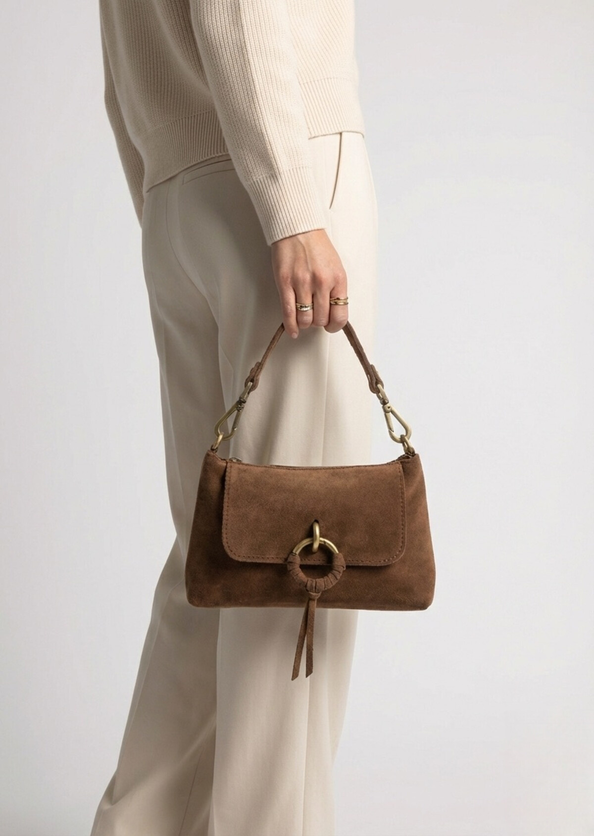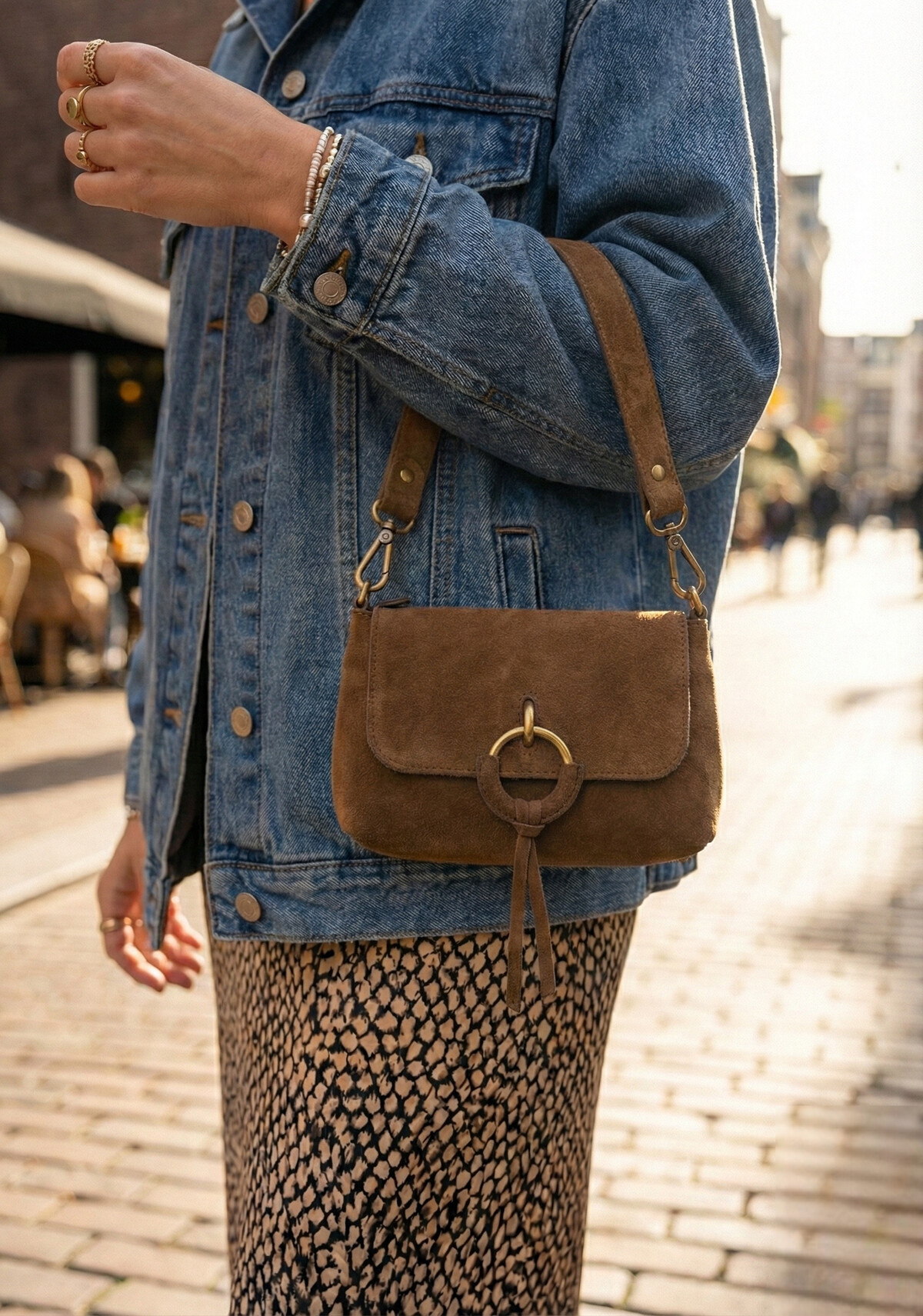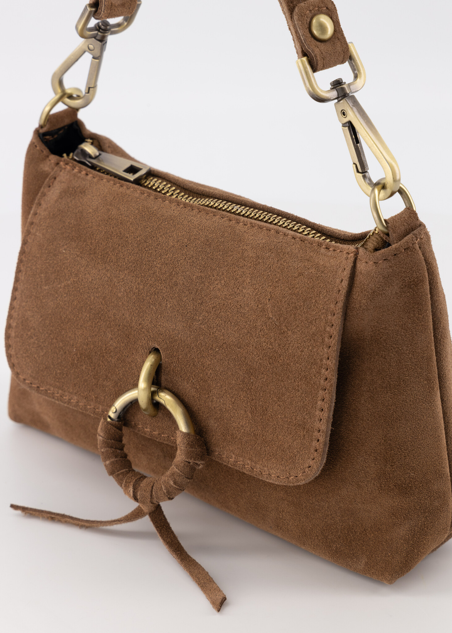 De absolute blikvanger is de unieke ring-sluiting op de flap, stijlvol omwikkeld met leer voor een ambachtelijk detail. De tas heeft een fijn, compact formaat dat perfect onder je arm past ("baguette style"), ideaal voor zowel een lunchafspraak als een avondje uit. Combineer hem met denim of een zwierige jurk en je look is compleet.