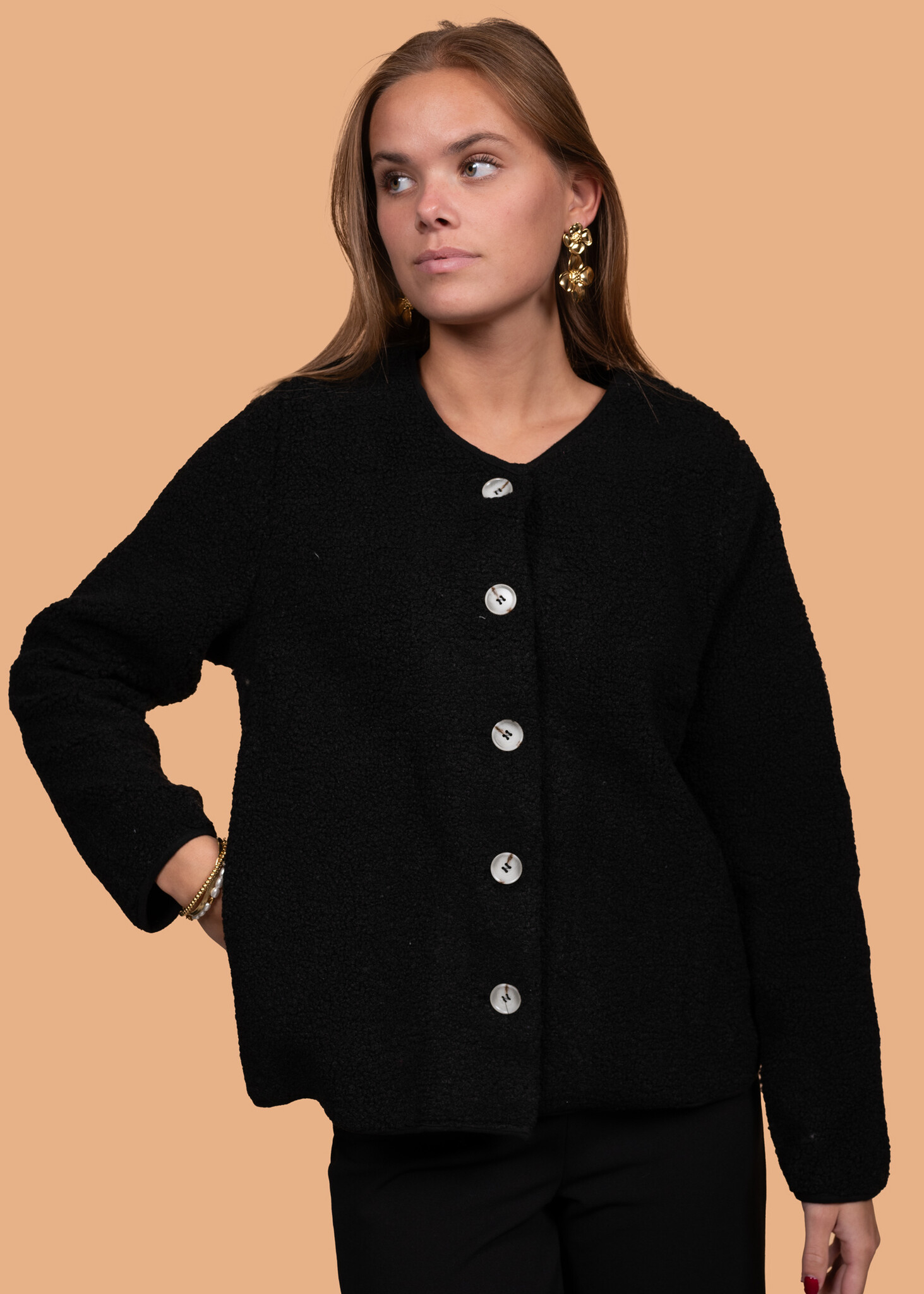 Dit zwarte teddy vest is heerlijk warm en zacht - perfect voor de koudere dagen. Draag hem open of dichtgeknoopt met de stijlvolle knopen. Een echte essential voor je herfst- en wintergarderobe!