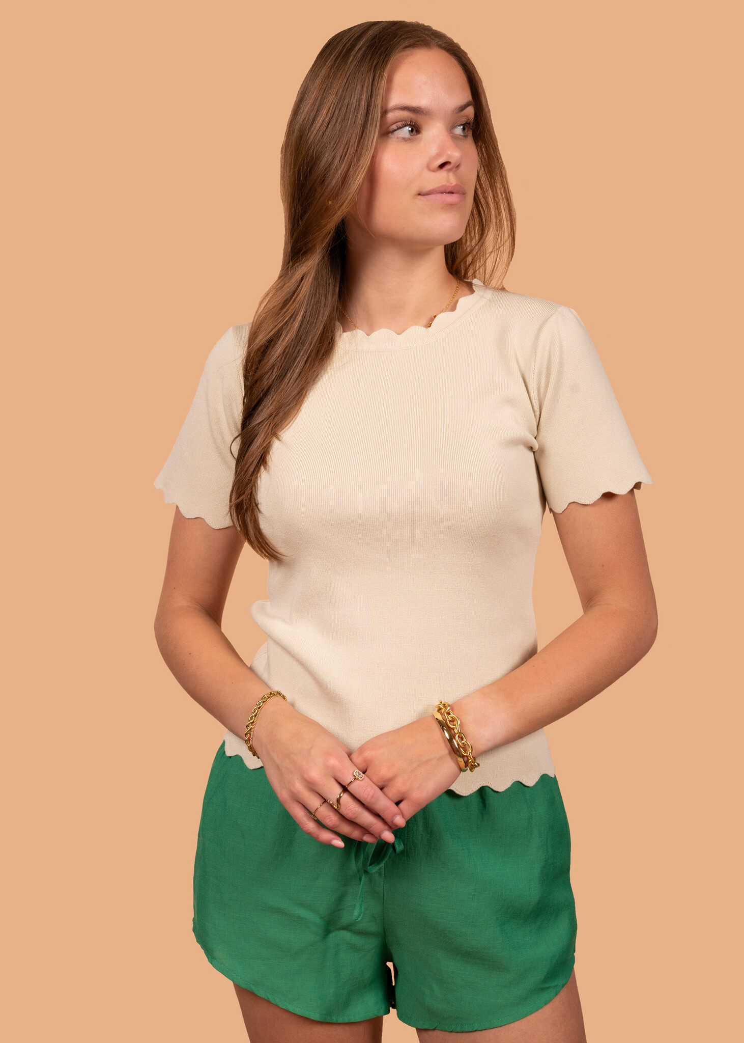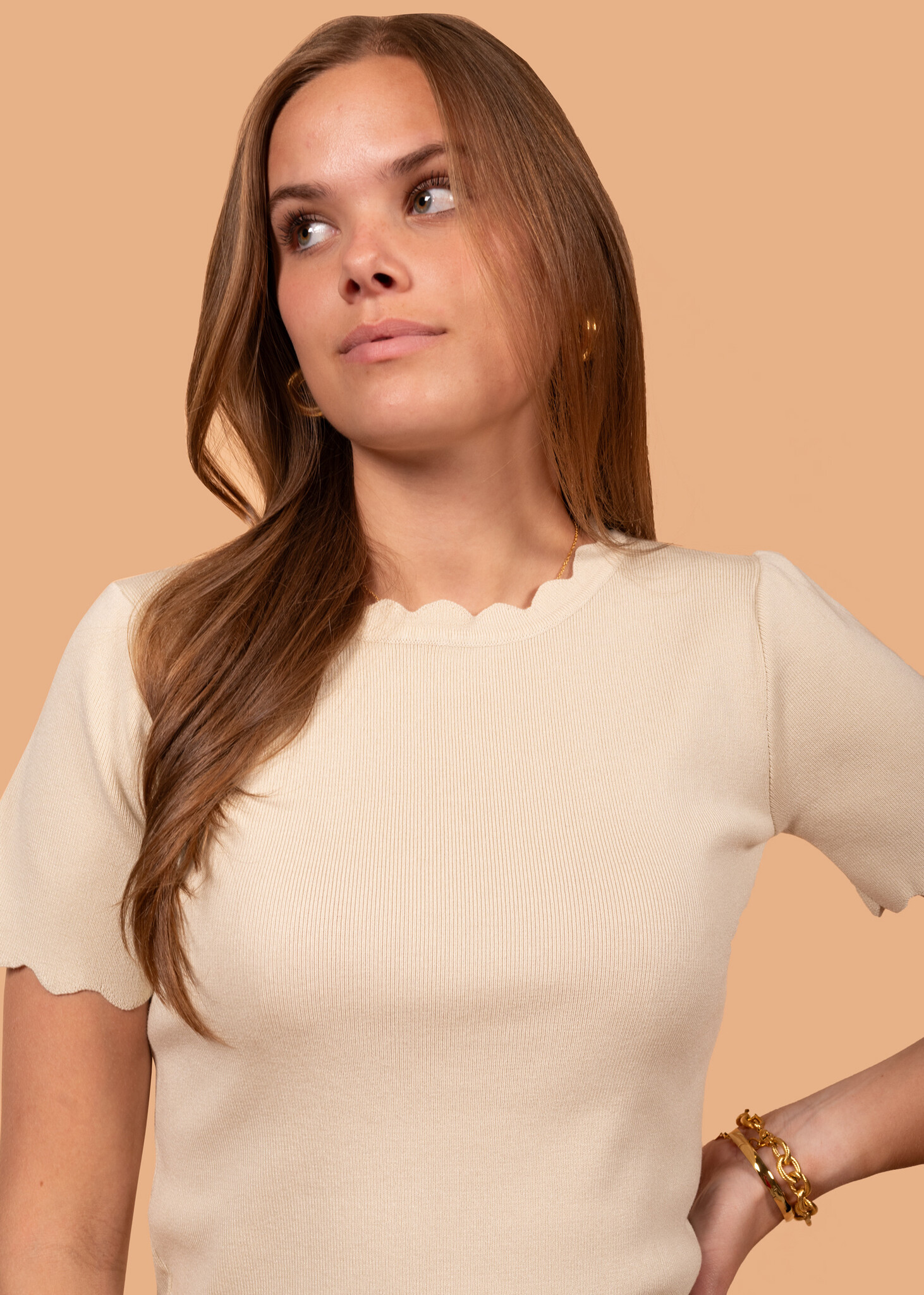 Op zoek naar een veelzijdige basic top met een speels tintje? Deze beige top is een echte essential voor in je garderobe!