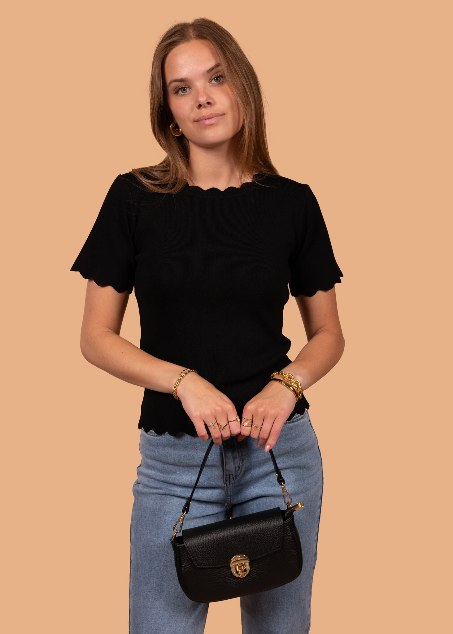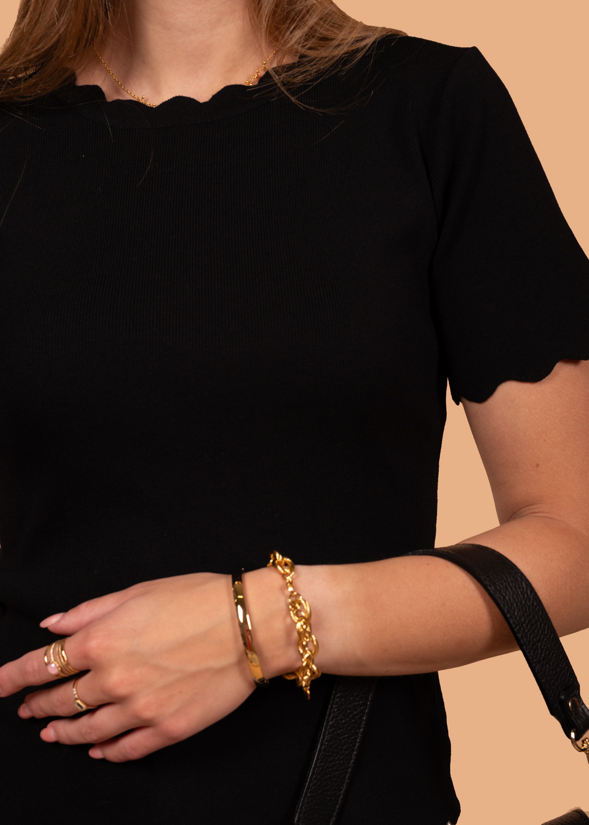 Op zoek naar een veelzijdige basic top met een speels tintje? Zoek niet verder! Deze zwarte top is alles wat je nodig hebt om je garderobe een upgrade te geven.