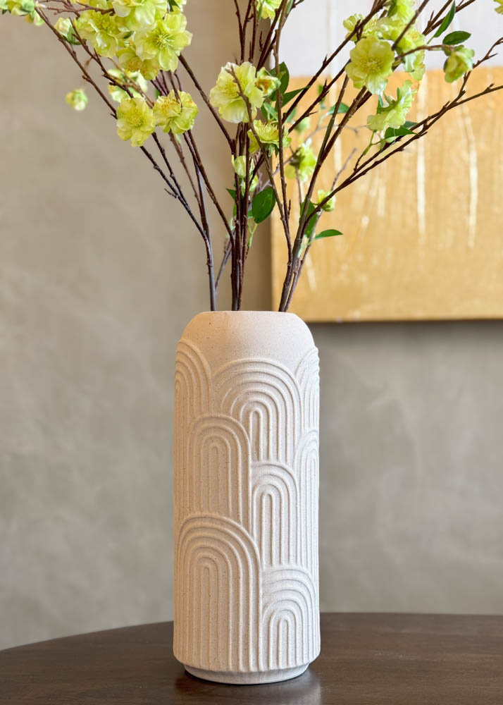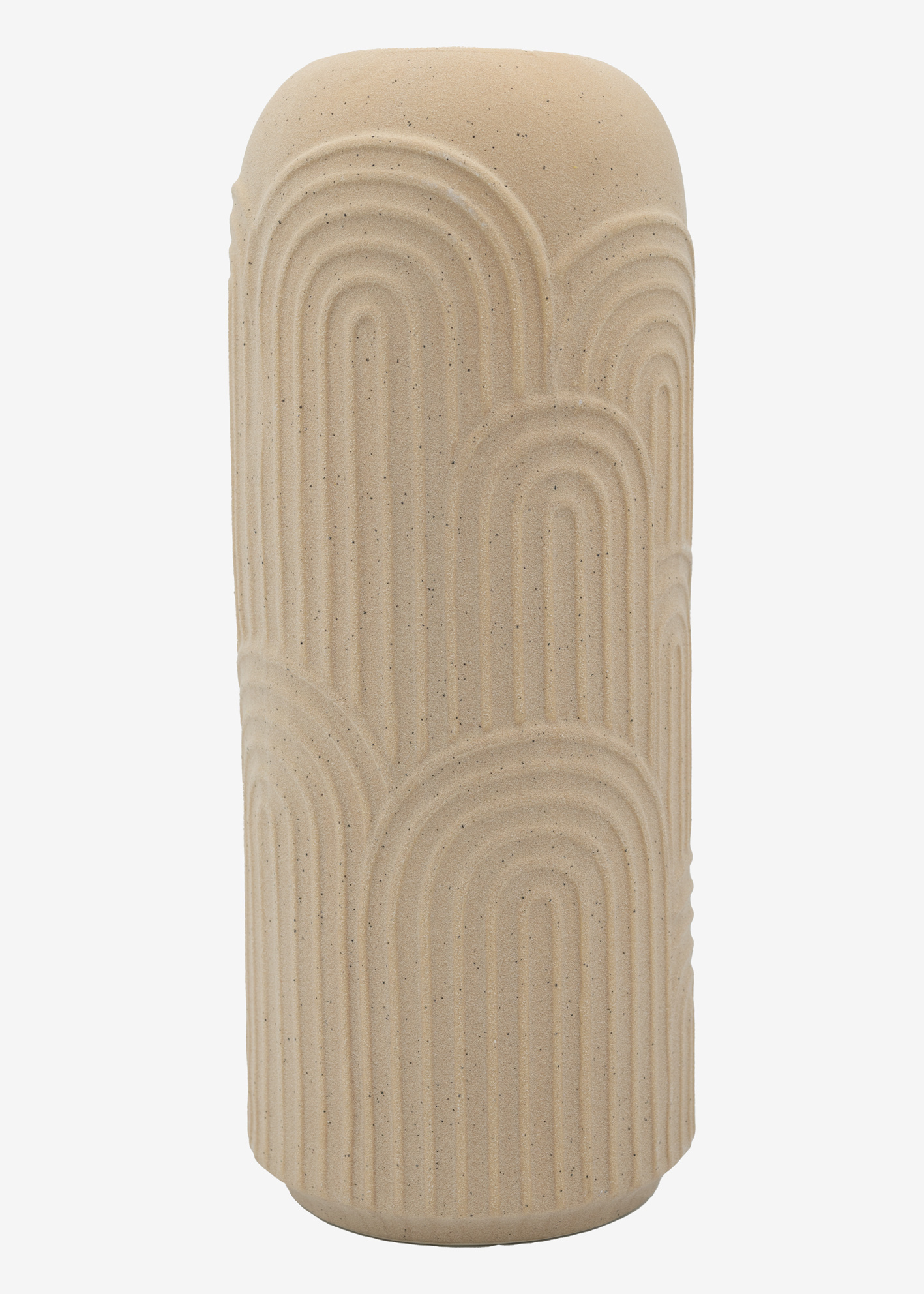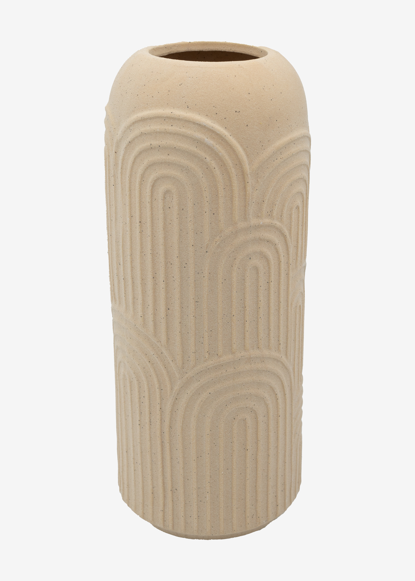 Op zoek naar een eyecatcher voor in je interieur? Deze beige vaas van keramiek is een echte musthave! Het unieke reliëf geeft de vaas een speelse touch en zorgt ervoor dat hij opvalt, zelfs zonder bloemen.