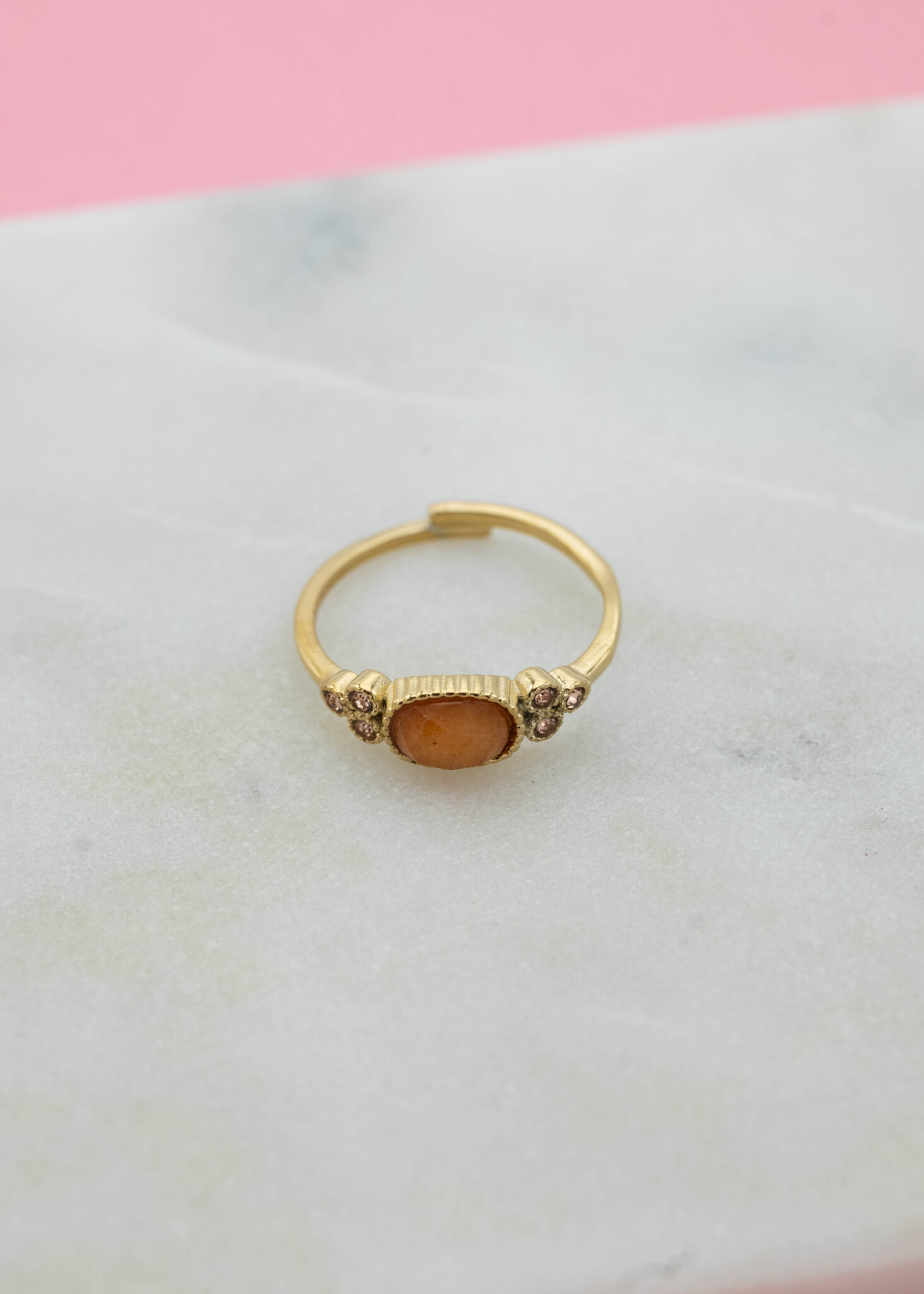 Deze beauty van een ring is een echte eyecatcher! De warme, amberkleurige steen geeft je outfit instant een vleugje vintage glamour.