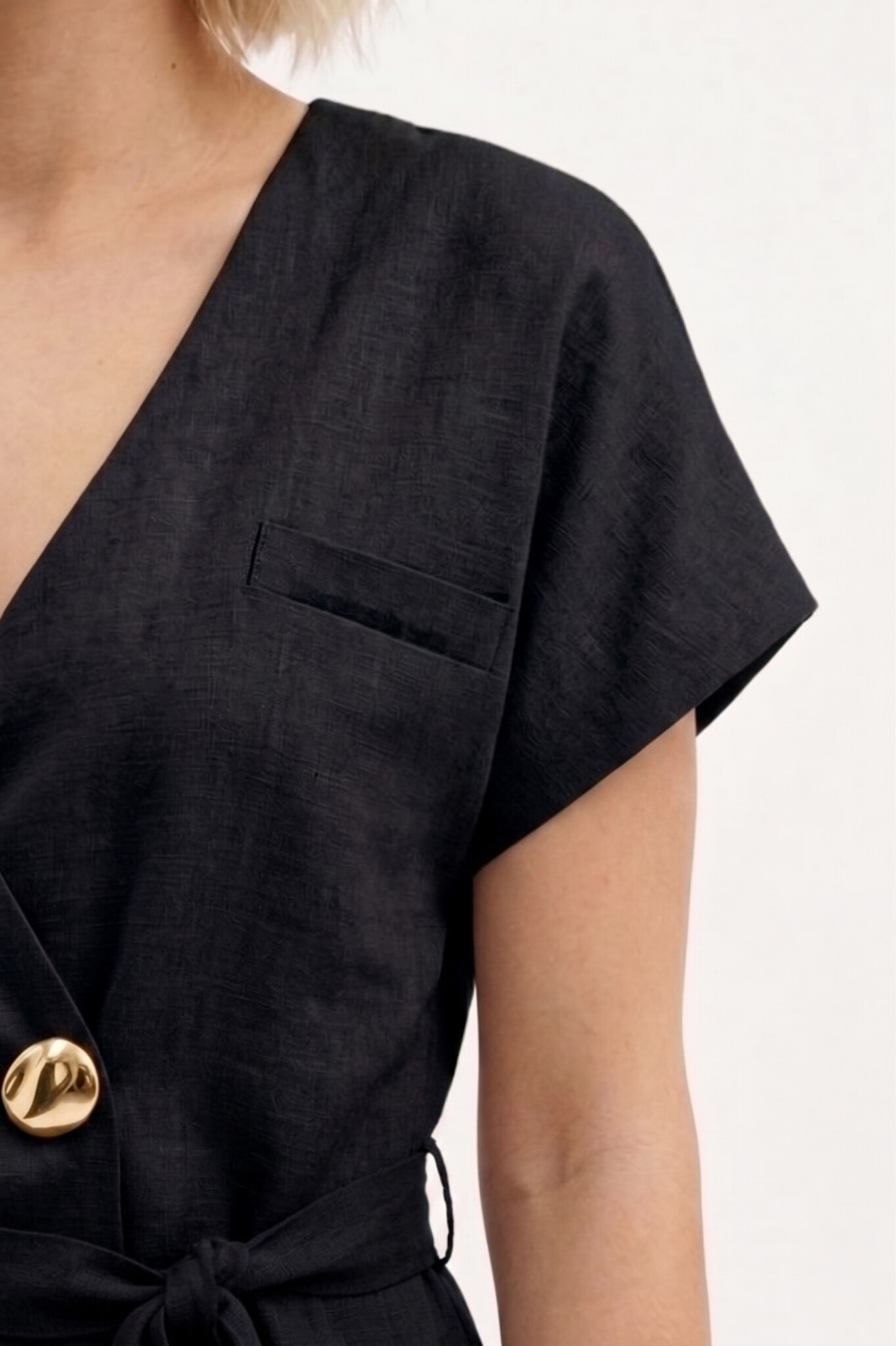 Deze zwarte top is echt een must-have voor je garderobe! Het is een super veelzijdige blouse die je op verschillende manieren kunt dragen. De wikkelblouse heeft een mooie V-hals en een stijlvolle knoop. De stof is gemaakt van een fijne mix van viscose en katoen, waardoor de top heerlijk zacht aanvoelt en lekker luchtig is. Perfect voor de warmere dagen, maar ook prima te dragen tijdens een avondje uit.