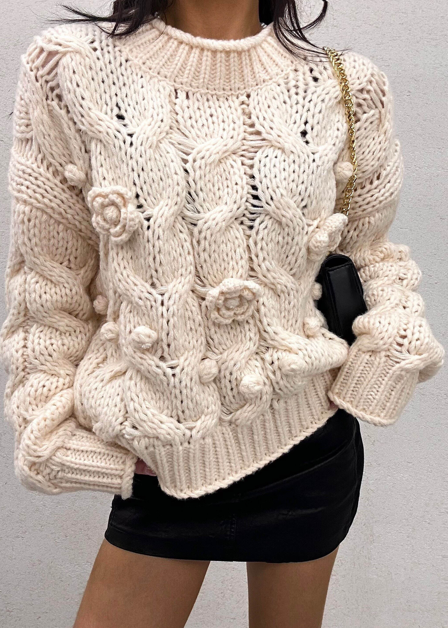 De trui heeft een superzachte, warme stof en is afgewerkt met speelse details. De gebreide roosjes geven ‘m een romantische touch, zonder dat het té zoet wordt.