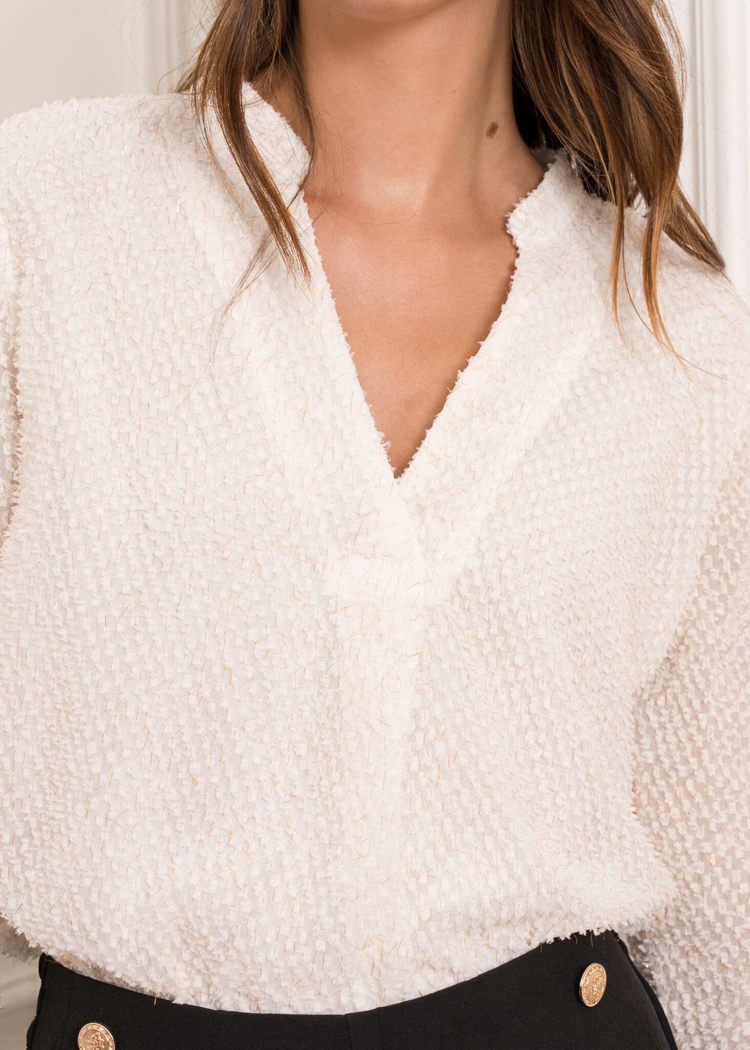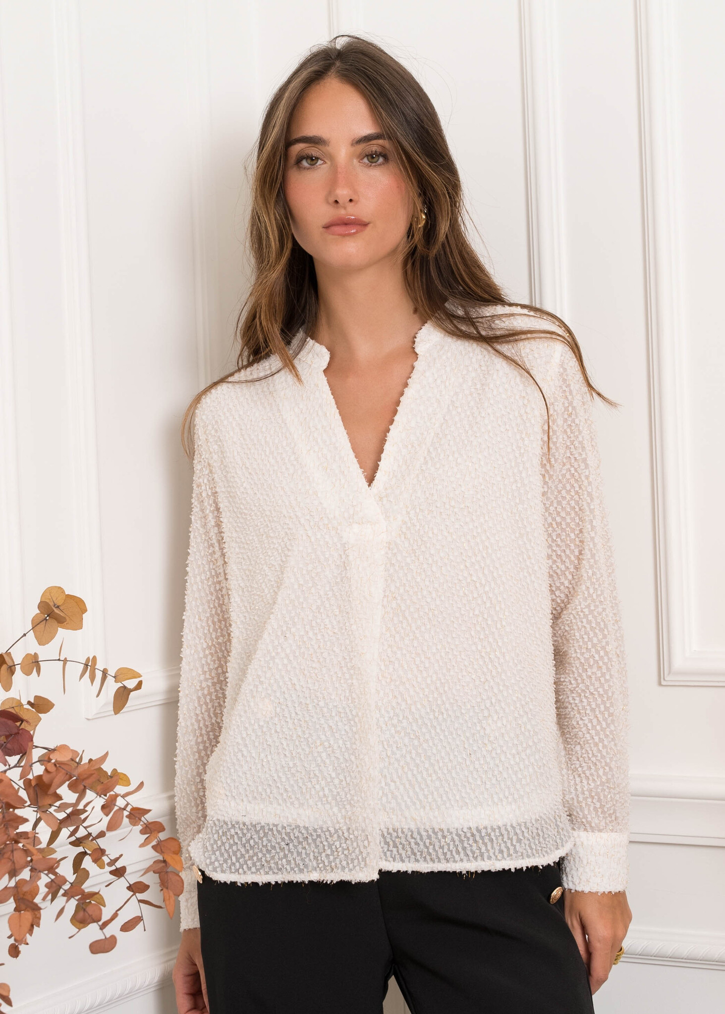 Op zoek naar een blouse die zowel stijlvol als speels is? Zoek niet verder! Deze prachtige witte blouse met subtiele dots is een echte eyecatcher. De stof voelt heerlijk zacht aan en de speelse dots geven de blouse een unieke touch.