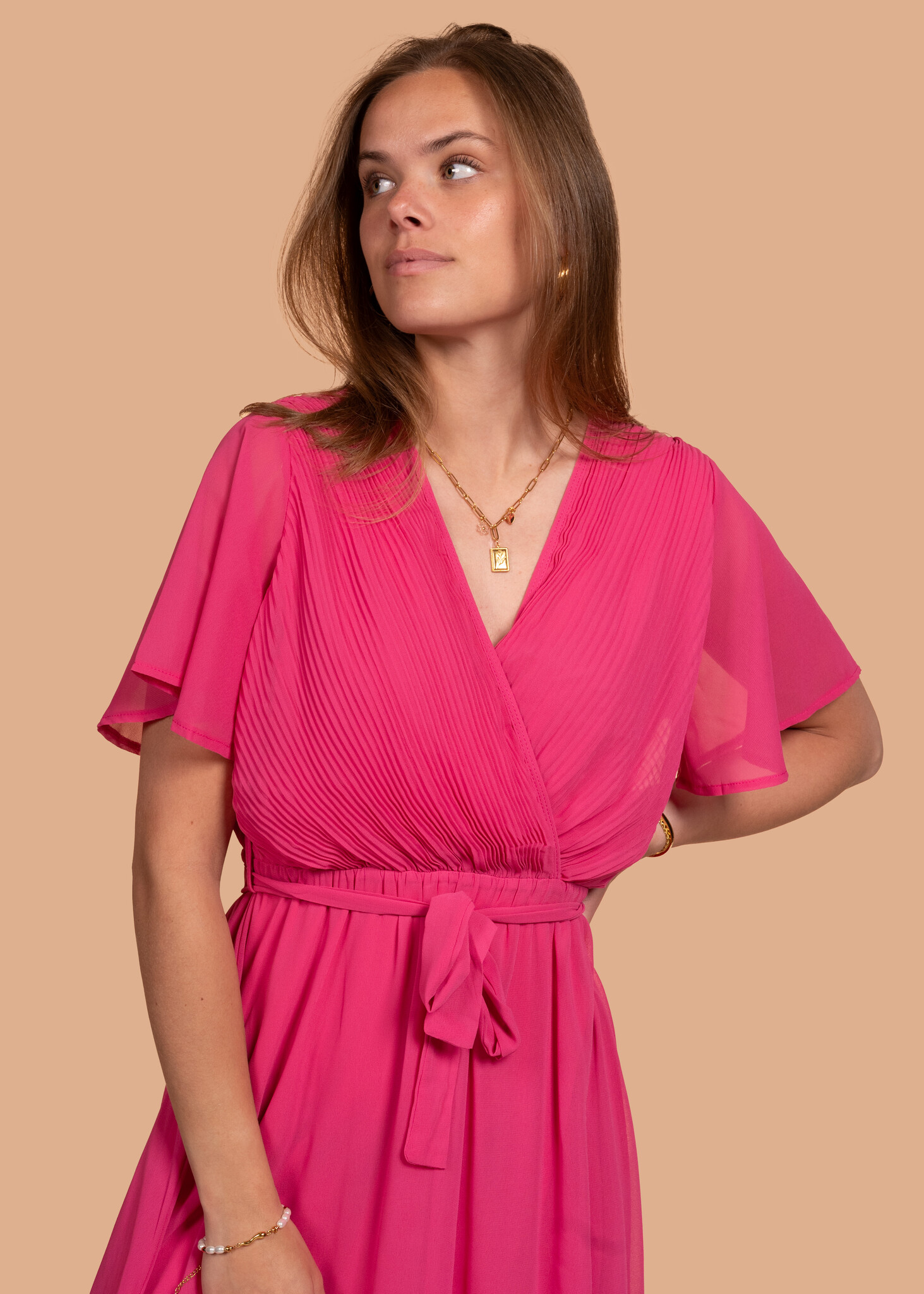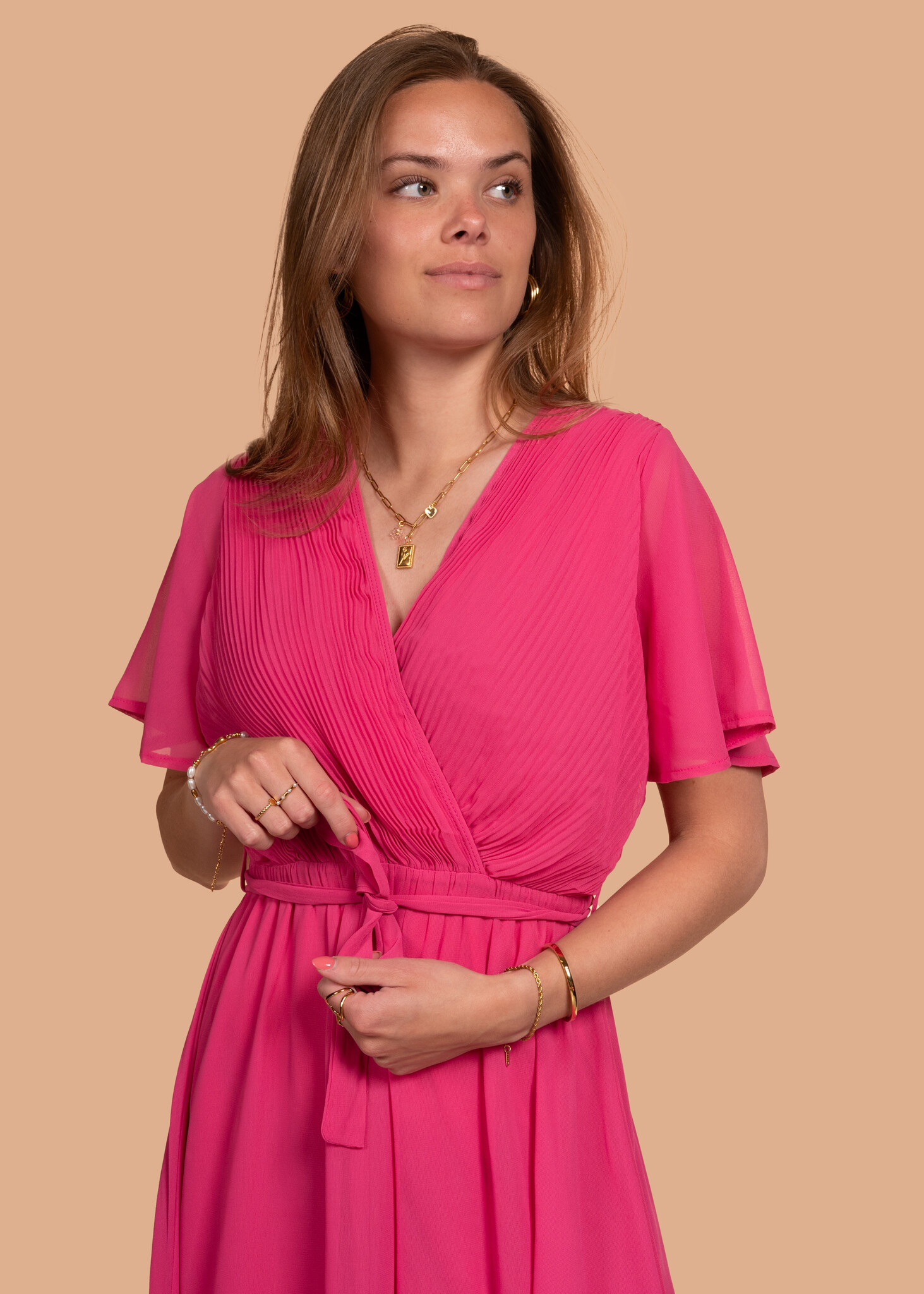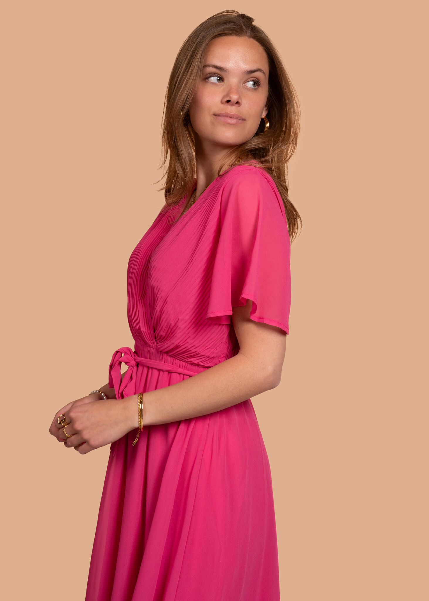 Klaar om te stralen deze zomer? Deze prachtige roze jurk is een echte eyecatcher! De mooie, elegante plooien geven de jurk een vrouwelijke touch, terwijl de korte mouwen en luchtige stof zorgen voor ultiem comfort tijdens warme dagen.