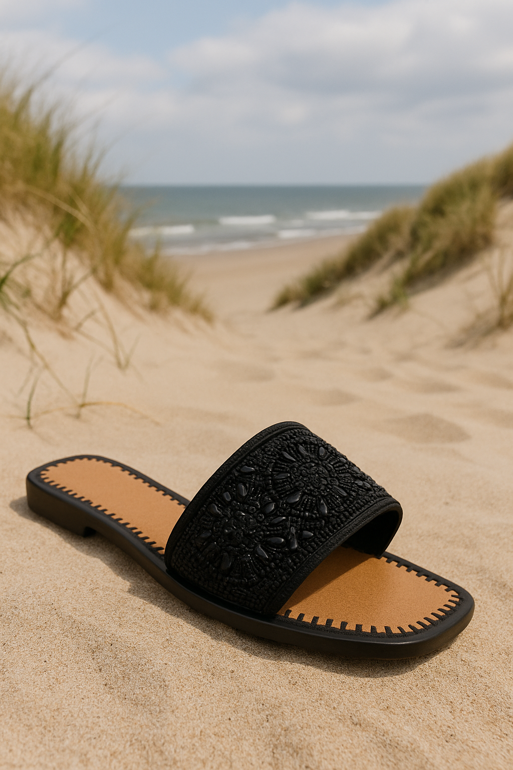 Deze zomerse sandalen zijn alles wat je nodig hebt! Ze zijn versierd met glinsterende steentjes die elke stap laten sprankelen. Of je nu naar het strand gaat, een terrasje pakt of gewoon lekker door de stad slentert, met deze slippers aan je voeten steel jij de show.